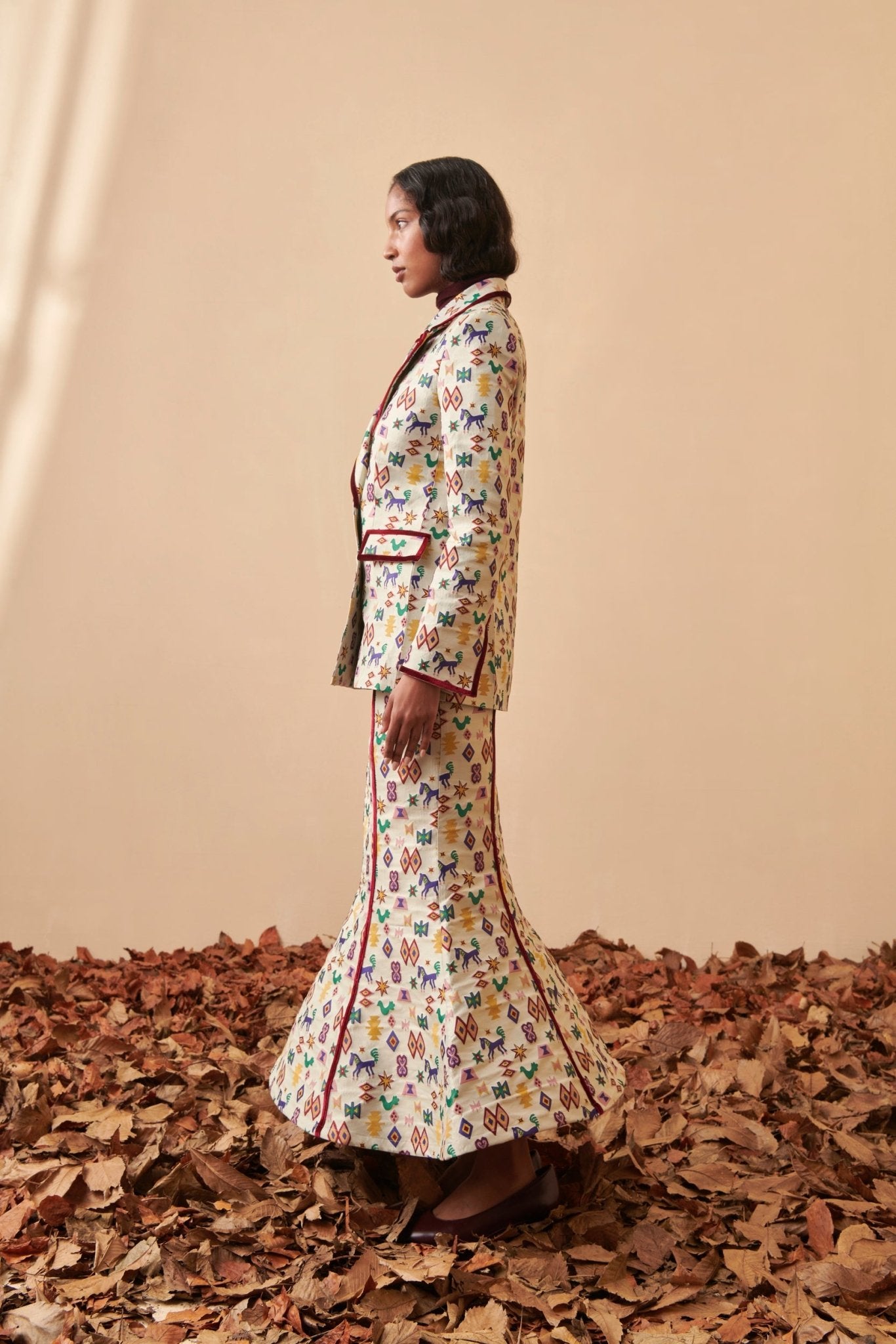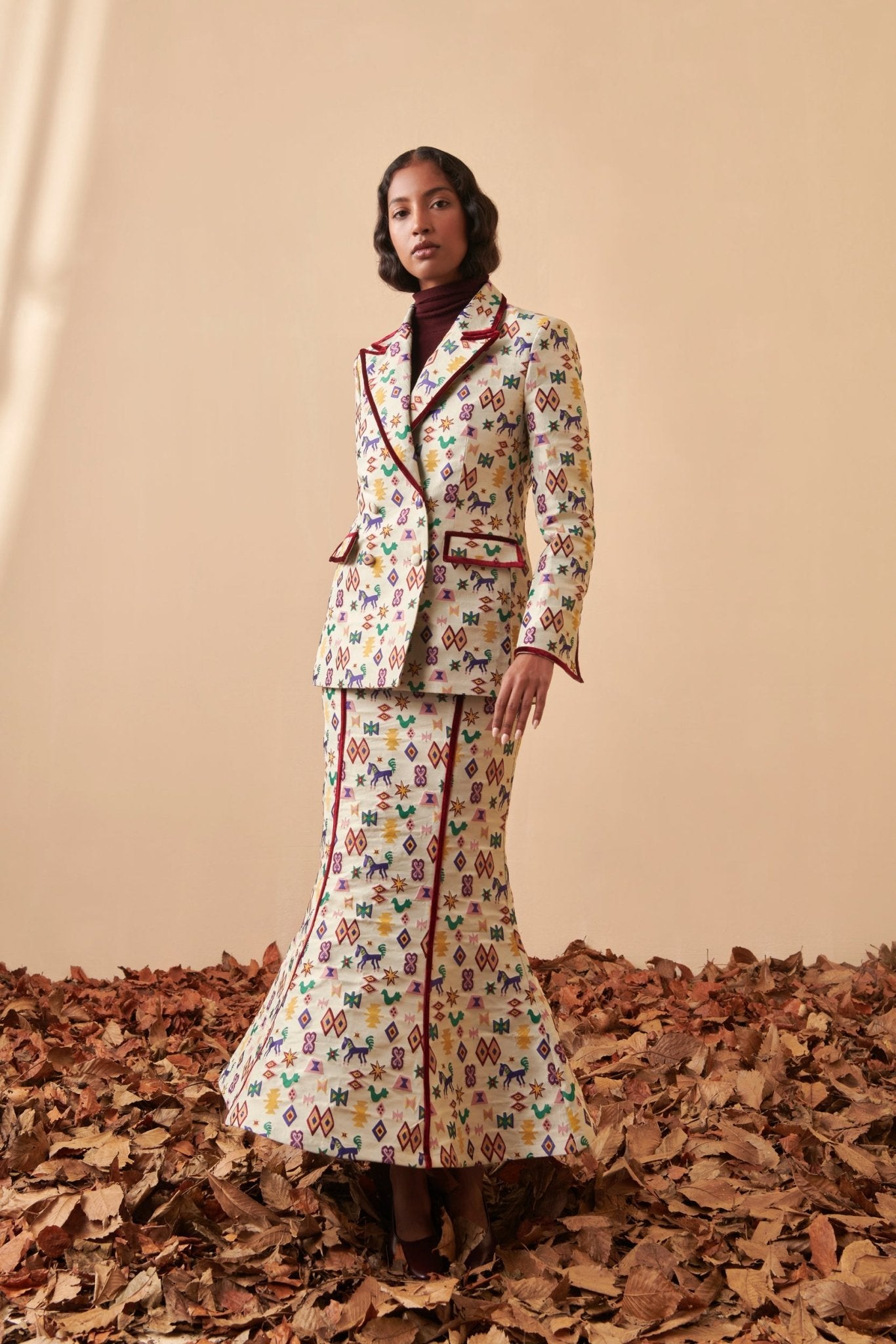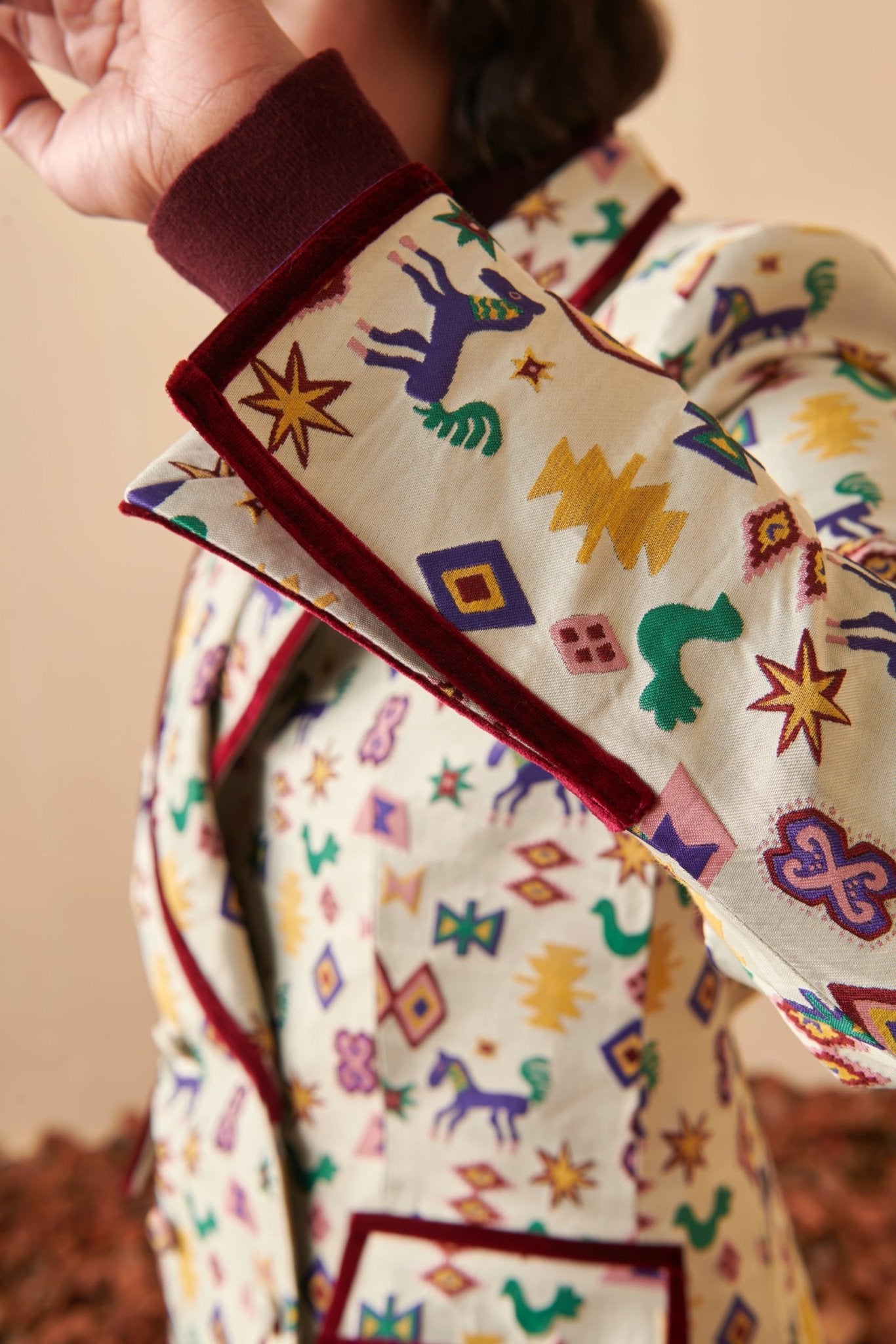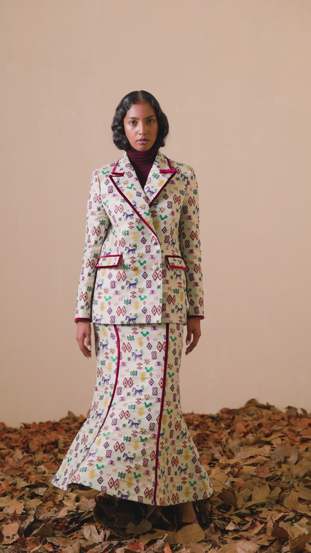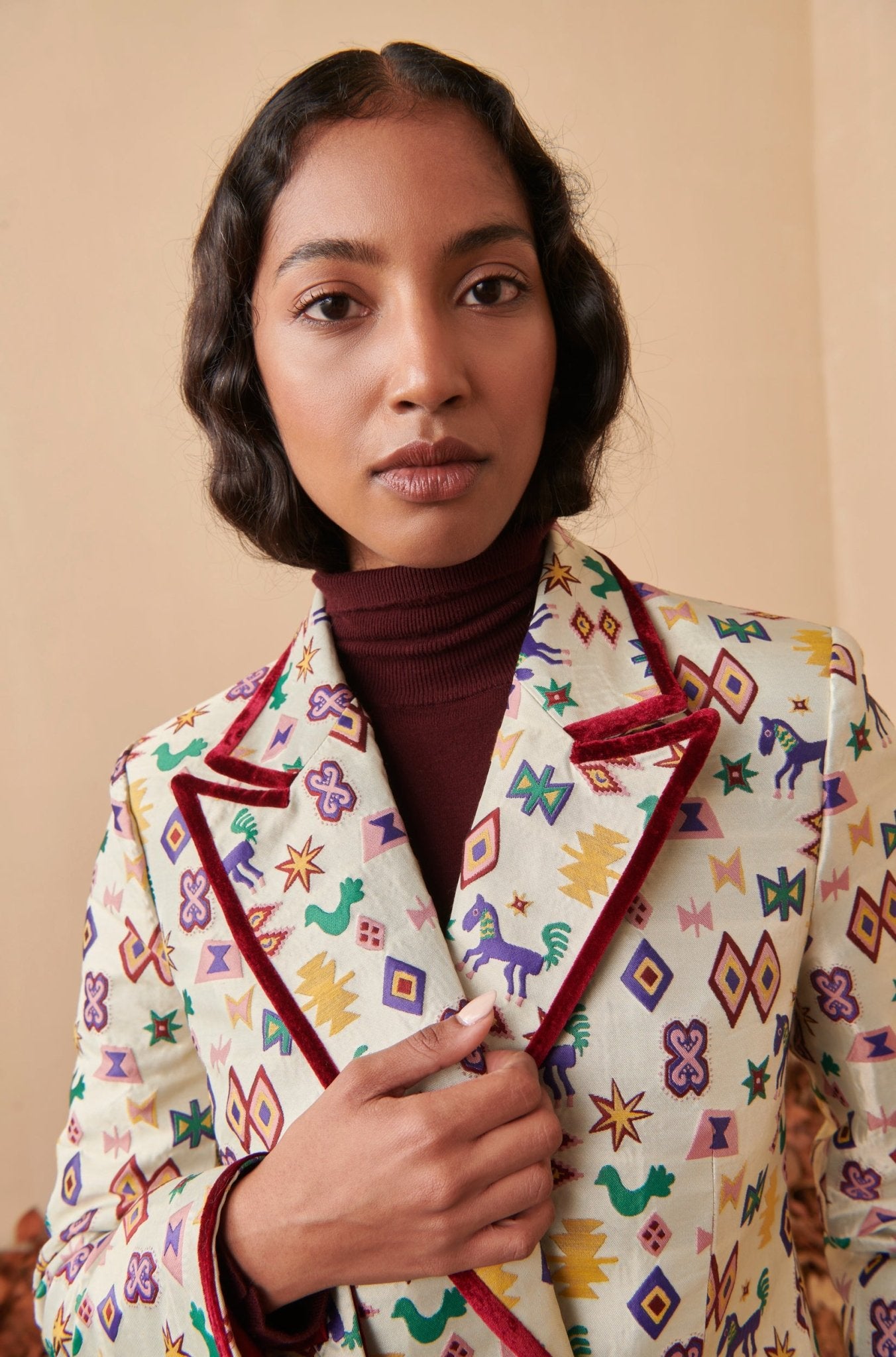 The Luminosa Jacket offers sharp tailoring with a vibrant twist. Crafted in a cream base fabric, it features an all-over multicolor print of horses, stars, diamonds, and abstract motifs in jewel tones of red, yellow, green, purple, and orange. Designed with a double-breasted front, peak lapels, and flap pockets, it’s accented with deep burgundy piping for a refined finish. Perfect for statement suiting when paired with matching trousers, or as a standout layer over winter separates.