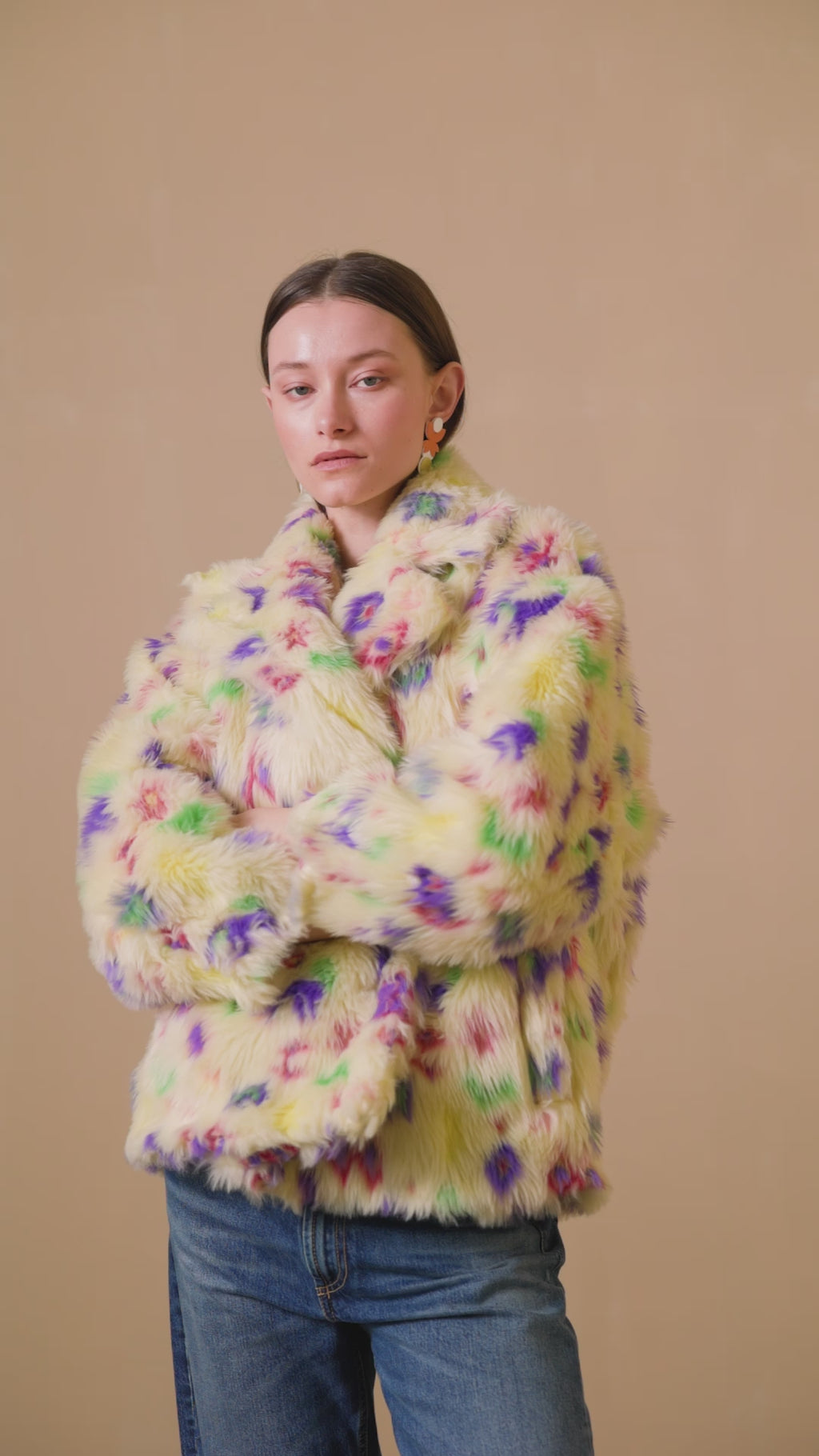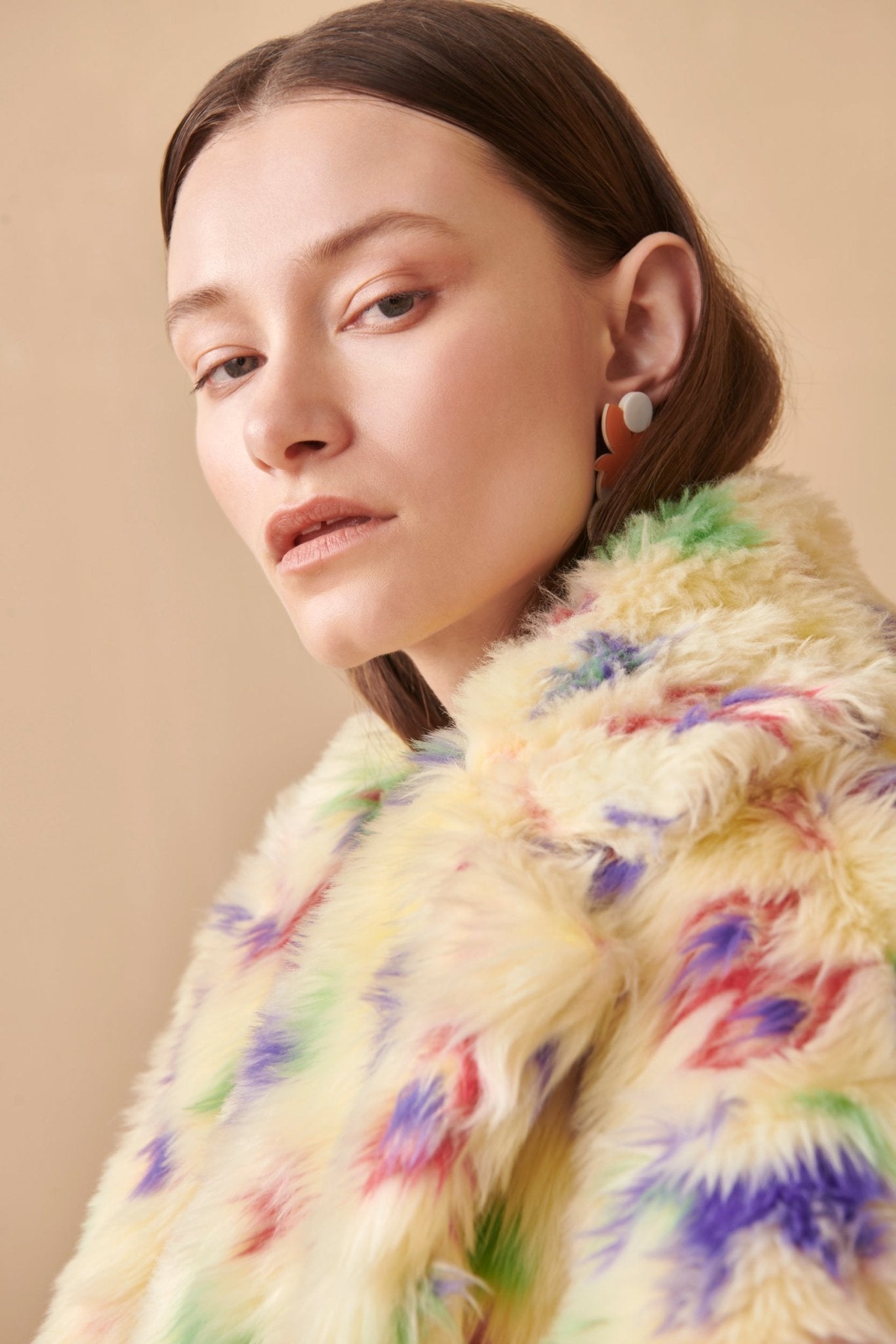 The Smill Jacket delivers warmth and whimsy in equal measure. Crafted from plush faux fur in a soft butter-yellow base, it’s adorned with an all-over multicolor folk-inspired pattern featuring diamonds, stars, horses, and abstract symbols in vibrant purple, red, green, and orange. Designed with a relaxed fit, wide lapels, and hidden front fastening, it’s the perfect statement outerwear for brightening cold-weather days. Style it over denim for casual cool or pair with tailored pieces for bold contrast.