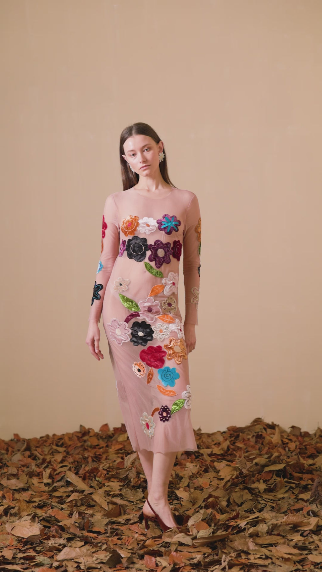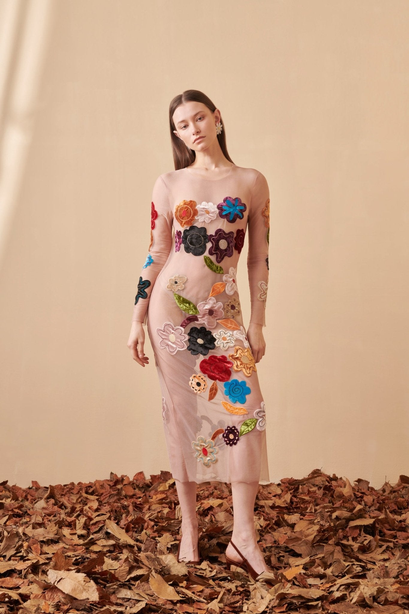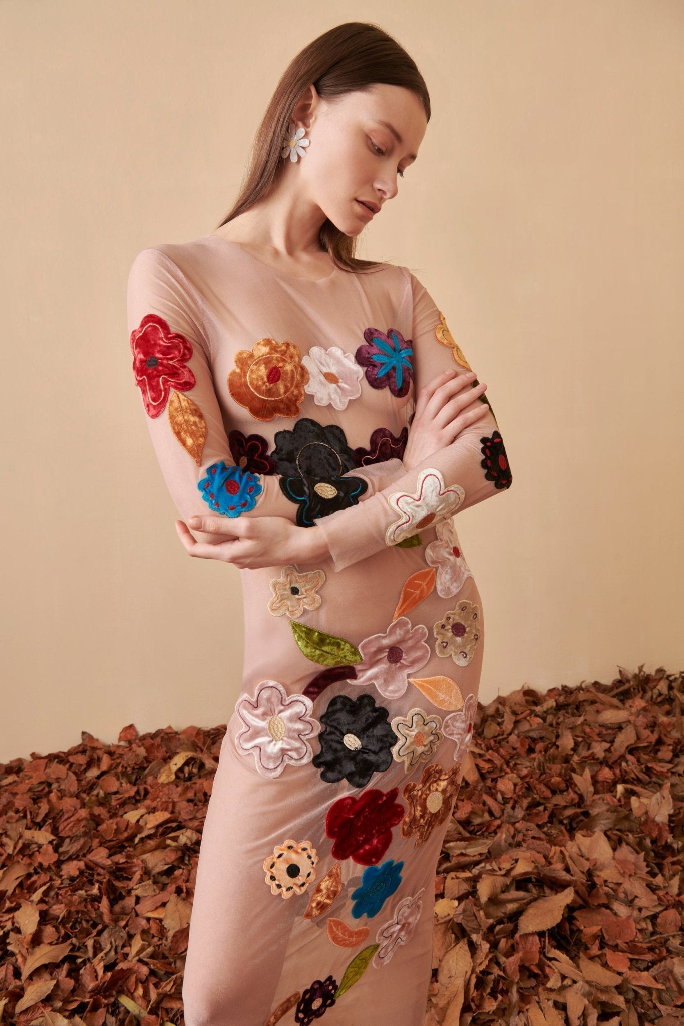 The Romance Dress blends ethereal elegance with vibrant artistry. Crafted in a nude mesh, it’s adorned with oversized floral appliqués in rich jewel tones, pastels, and velvety textures, creating a garden-like cascade across the body. The slim, long-sleeved silhouette skims the figure for a refined yet whimsical effect. A show-stopping choice for evening events, gallery openings, or fashion-forward winter occasions.