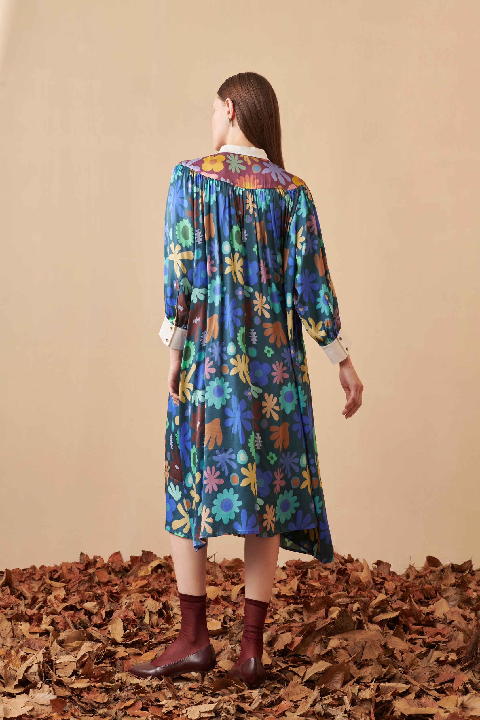 The Sensitivity Dress offers an effortless, relaxed silhouette in a bold floral print of blue, green, yellow, and red. Designed with a rounded neckline, subtle pleating, and three-quarter sleeves, it combines comfort with playful elegance. A versatile midi dress perfect for day-to-day wear or casual gatherings.