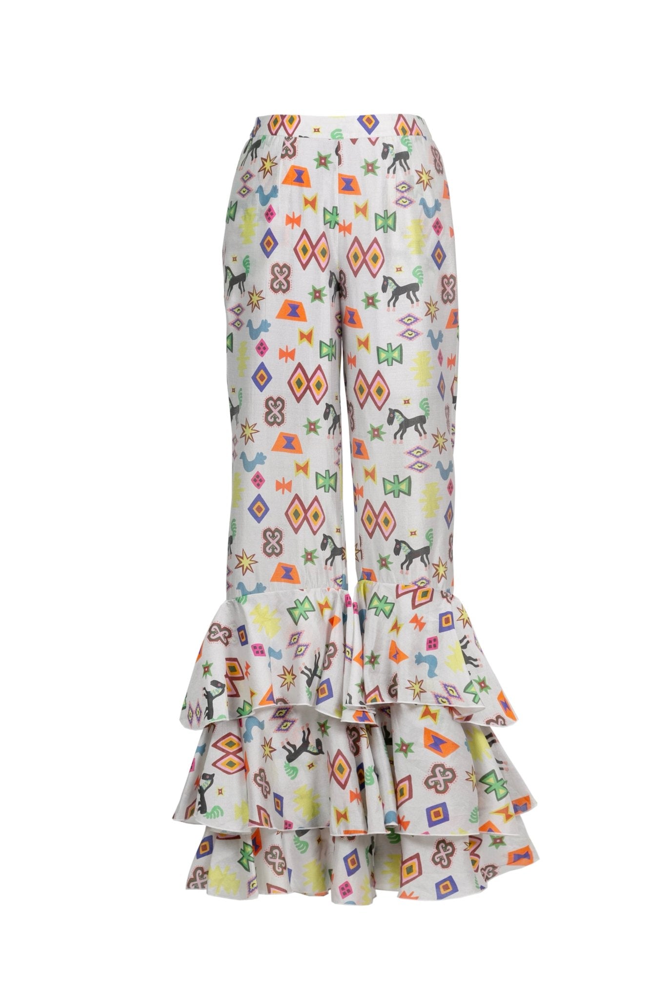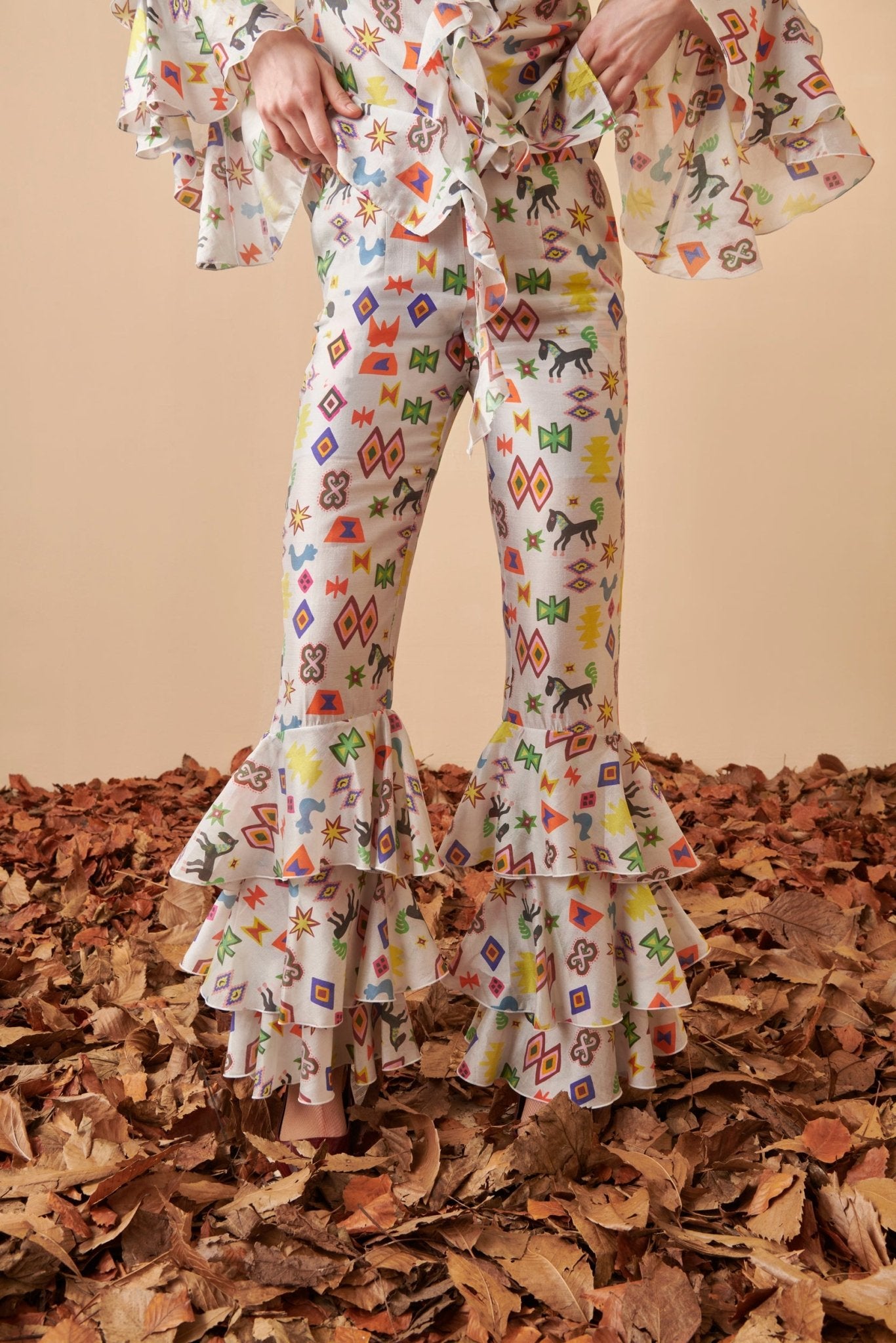 The Delight Trousers bring playful movement with their tiered ruffle hems. Designed in the same floral print as the top, they create a festive statement when styled together. Side zipper closure. Comfortable yet striking, these pants are perfect for special gatherings or standout day-to-night looks.
