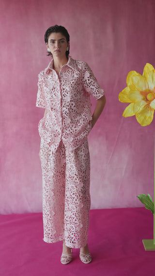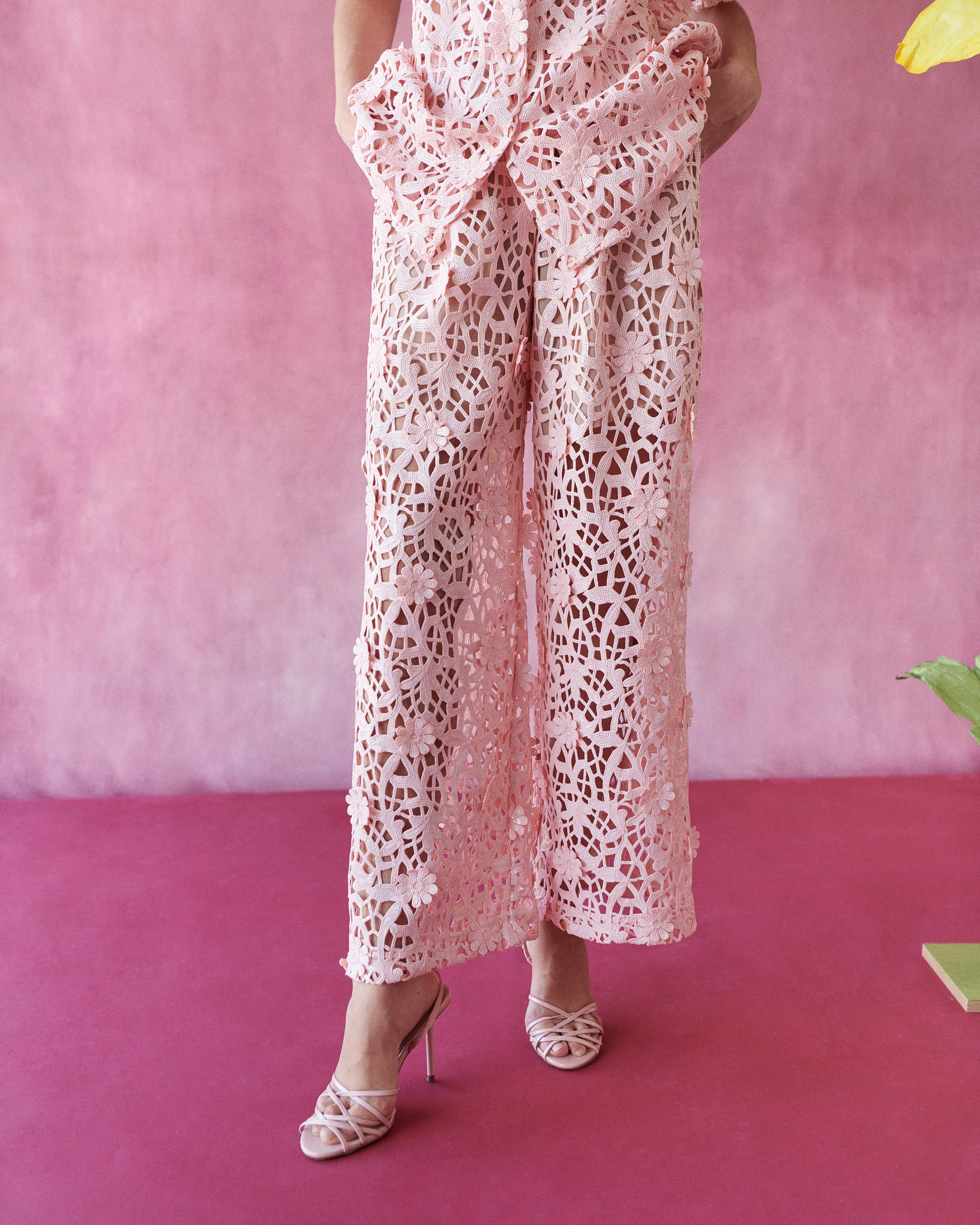 Statement wide leg trousers in pink openwork lace with sequin detailing and embossed floral details that add texture.