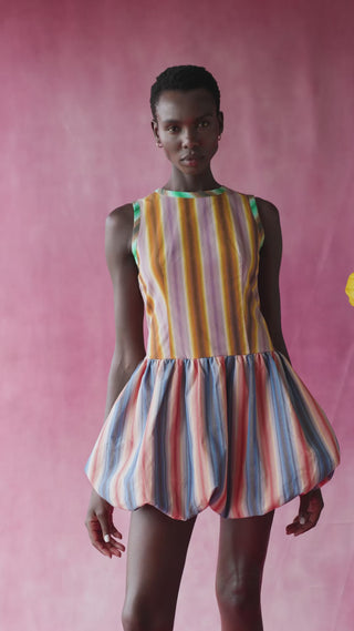Las rayas de colores estilizan visualmente, y los ribetes en contraste enmarcan el escote y las sisas. Los tirantes traseros con lazada permiten ajustarlo a tu medida y lleva cremallera lateral invisible.