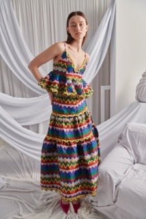 El top Devotion es una prenda vibrante y voluminosa con un peplum escalonado. Confeccionado con llamativos estampados geométricos y detalles amarillos festoneados, aporta movimiento y estructura a la vez que festivo. Diseñado para lucirse con la falda a juego y lograr un look impactante, o bien, para un estilo único con un toque desenfadado y sofisticado.
