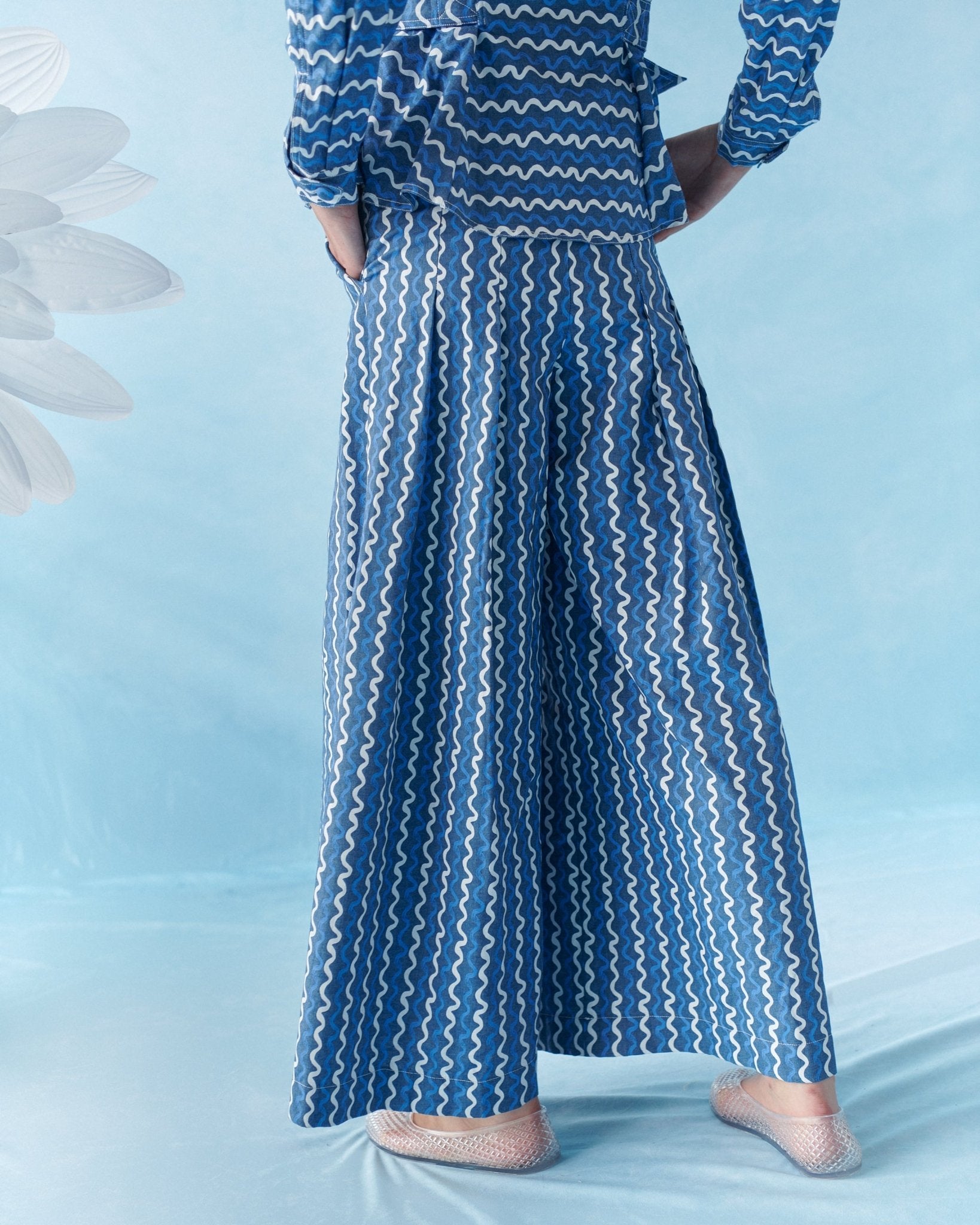 Pantalón palazzo en denim ligero, diseñado para aportar movimiento y alargar la silueta.