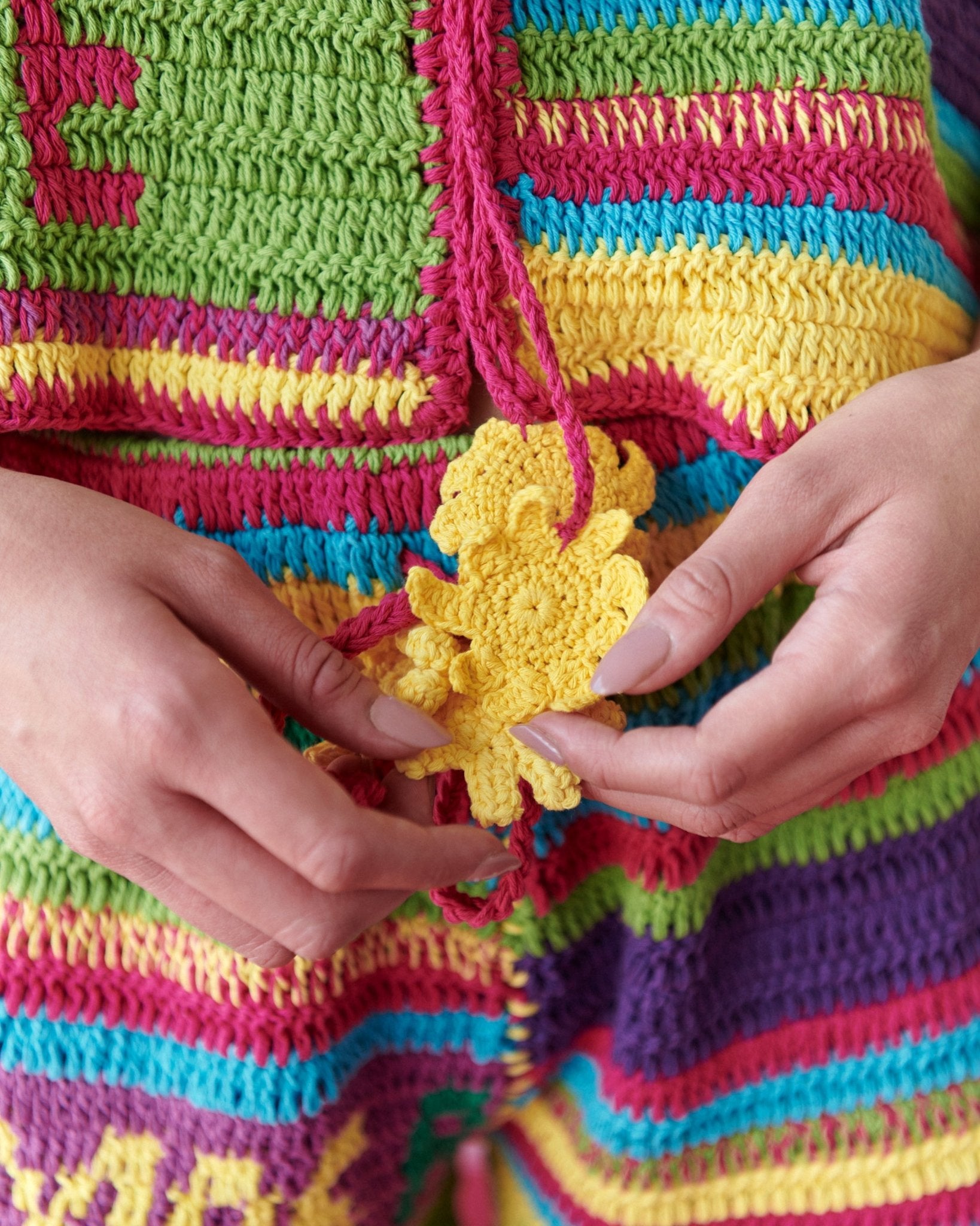 Pantalón corto de crochet cómodo y con mucha personalidad. La cintura se ajusta con cordones acabados en detalles bordados en forma de sol que le dan un toque divertido.