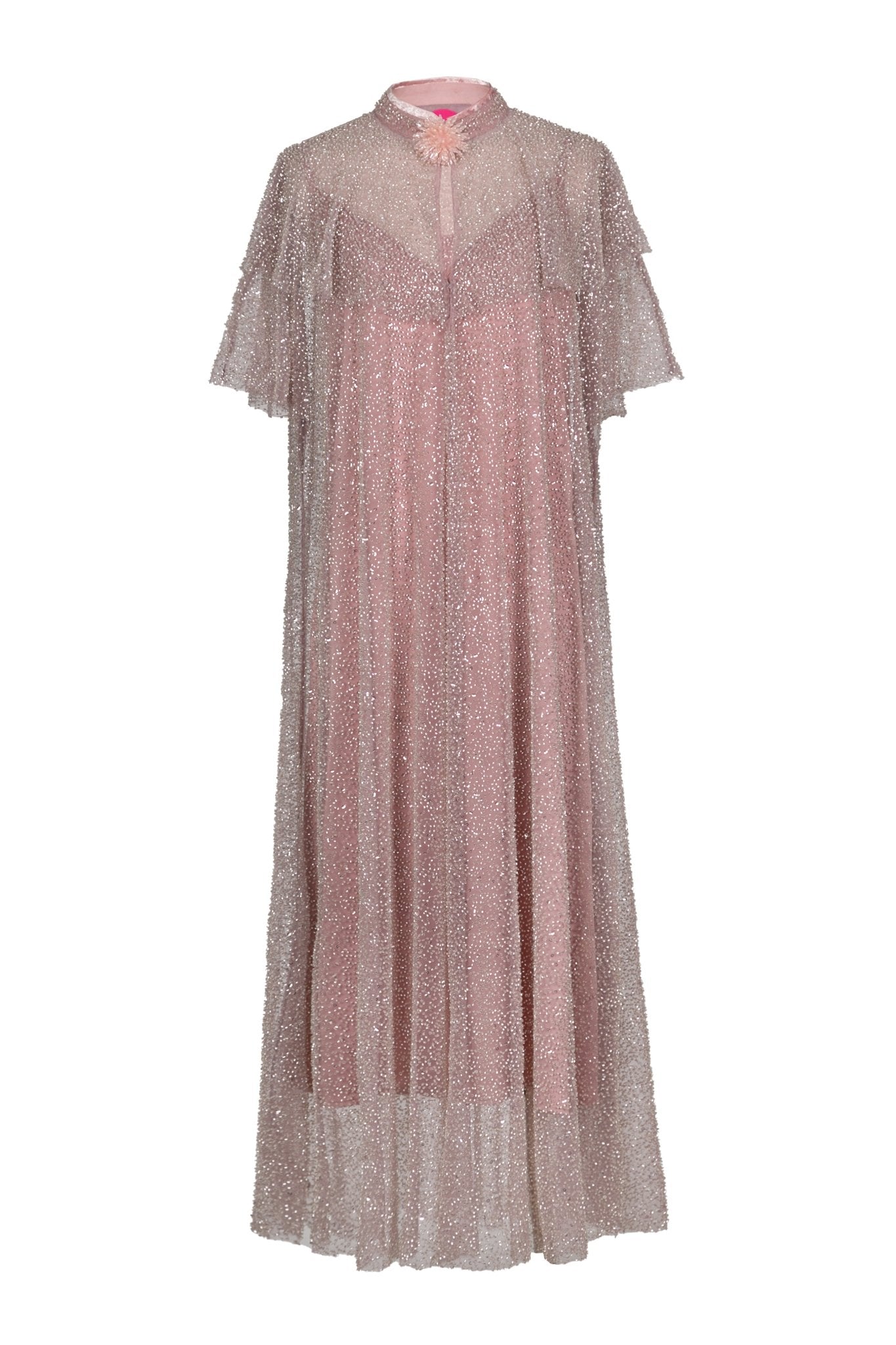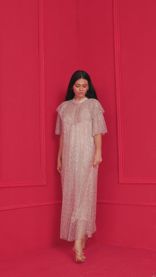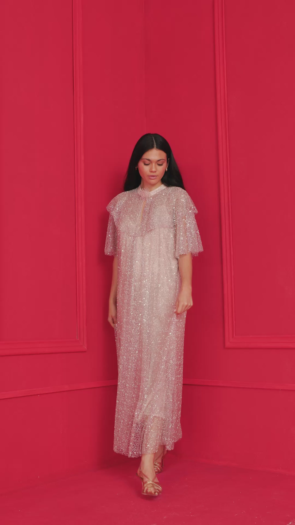 Como un sueño etéreo en rosa pálido, este vestido largo está completamente cubierto de delicadas lentejuelas, creando un efecto luminoso, que apenas pesa. Con mangas cortas con volantes, un sutil escote en la parte delantera y un adorno en forma de flor en el cuello, irradia una elegancia discreta y un romanticismo refinado. Una declaración de glamour discreto para veladas inolvidables.