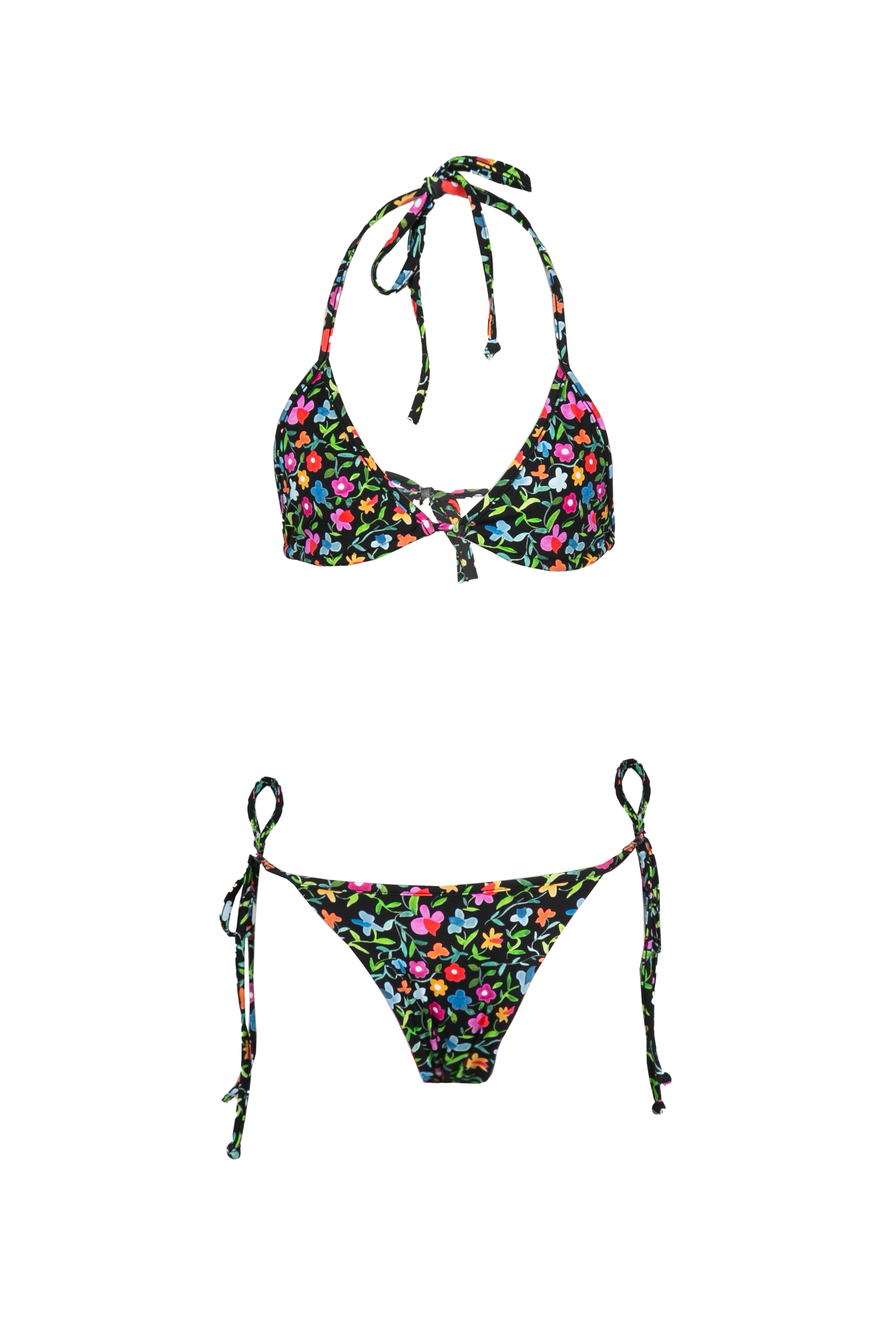 Divertido y clásico a partes iguales, el bikini Antares es perfecto para los días soleados. La base negra está repleta de coloridos estampados florales de inspiración retro que resaltan tu brillo veraniego. Tanto el top triangular, que se ata al cuello y a la espalda, como la braguita, con lazos laterales, se ajustan fácilmente para mayor comodidad.