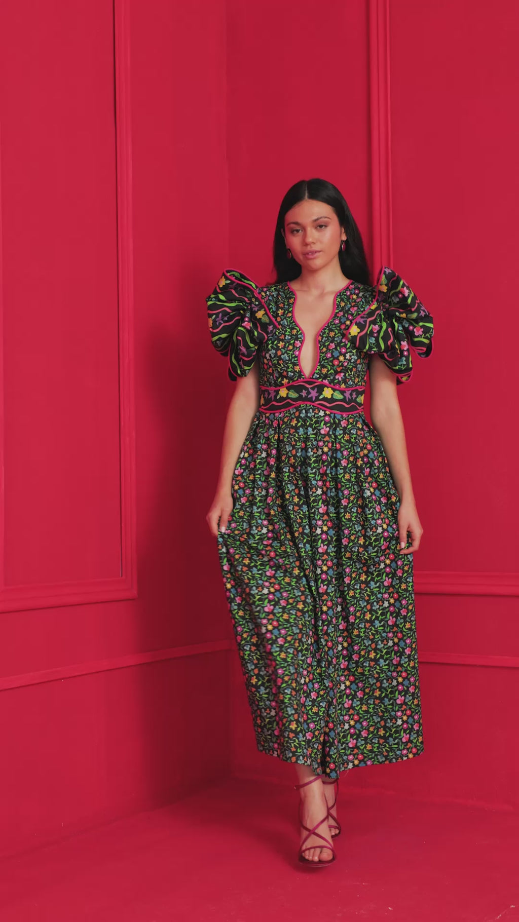 Este vestido es una auténtica joya que combina una estructura espectacular con encanto. Sus mangas abullonadas, su atrevido escote y su cintura ceñida y decorada con bordados florales crean una silueta favorecedora. Su estampado baila sobre un fondo negro intenso, convirtiendo cada movimiento en una celebración. El Asteri, una de nuestras siluetas estrella, será tu mejor aliado durante el verano.
