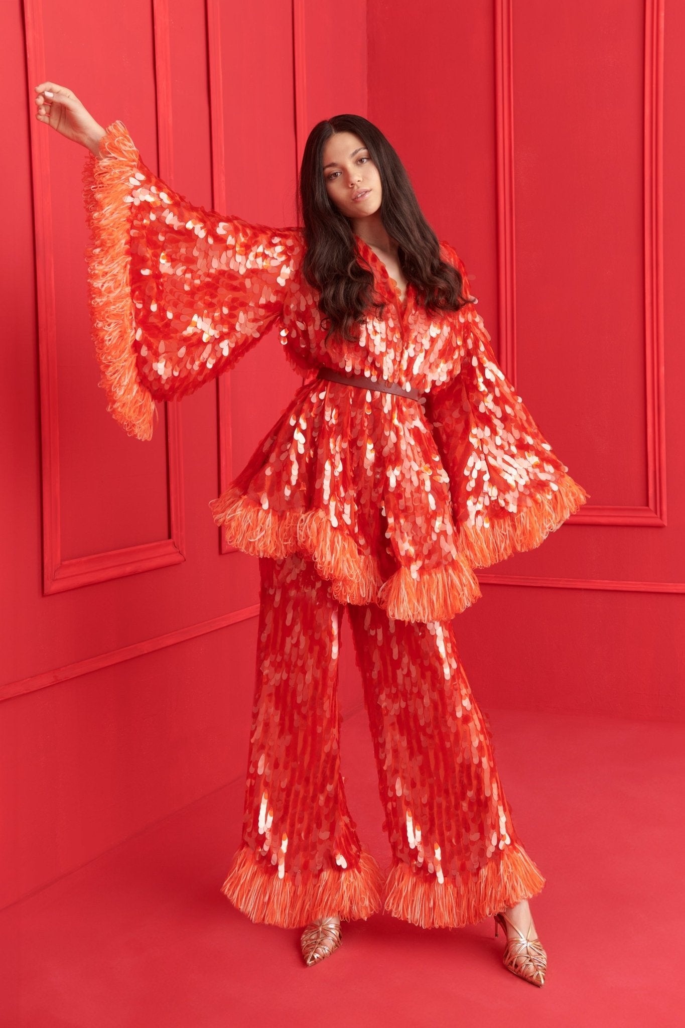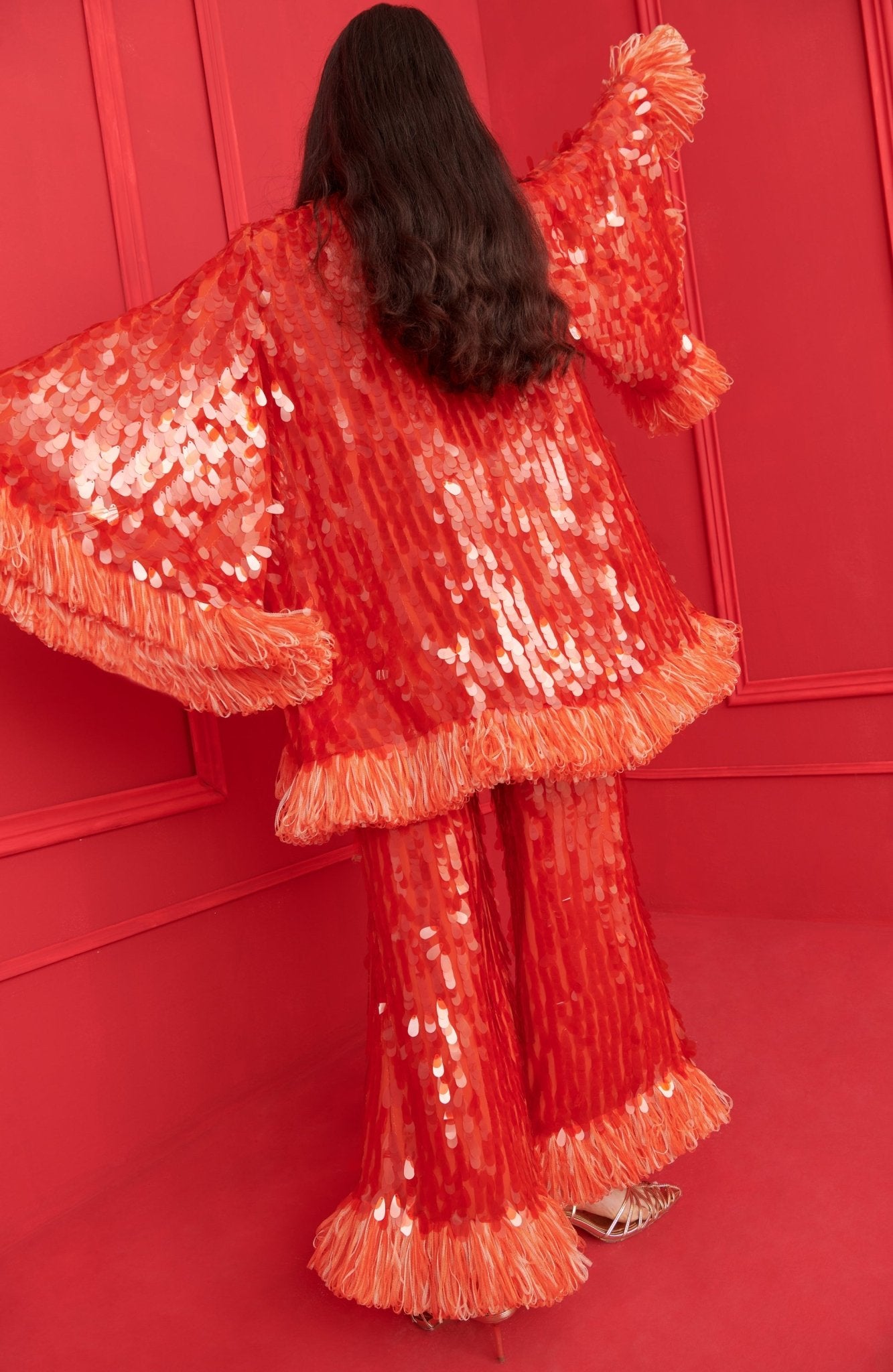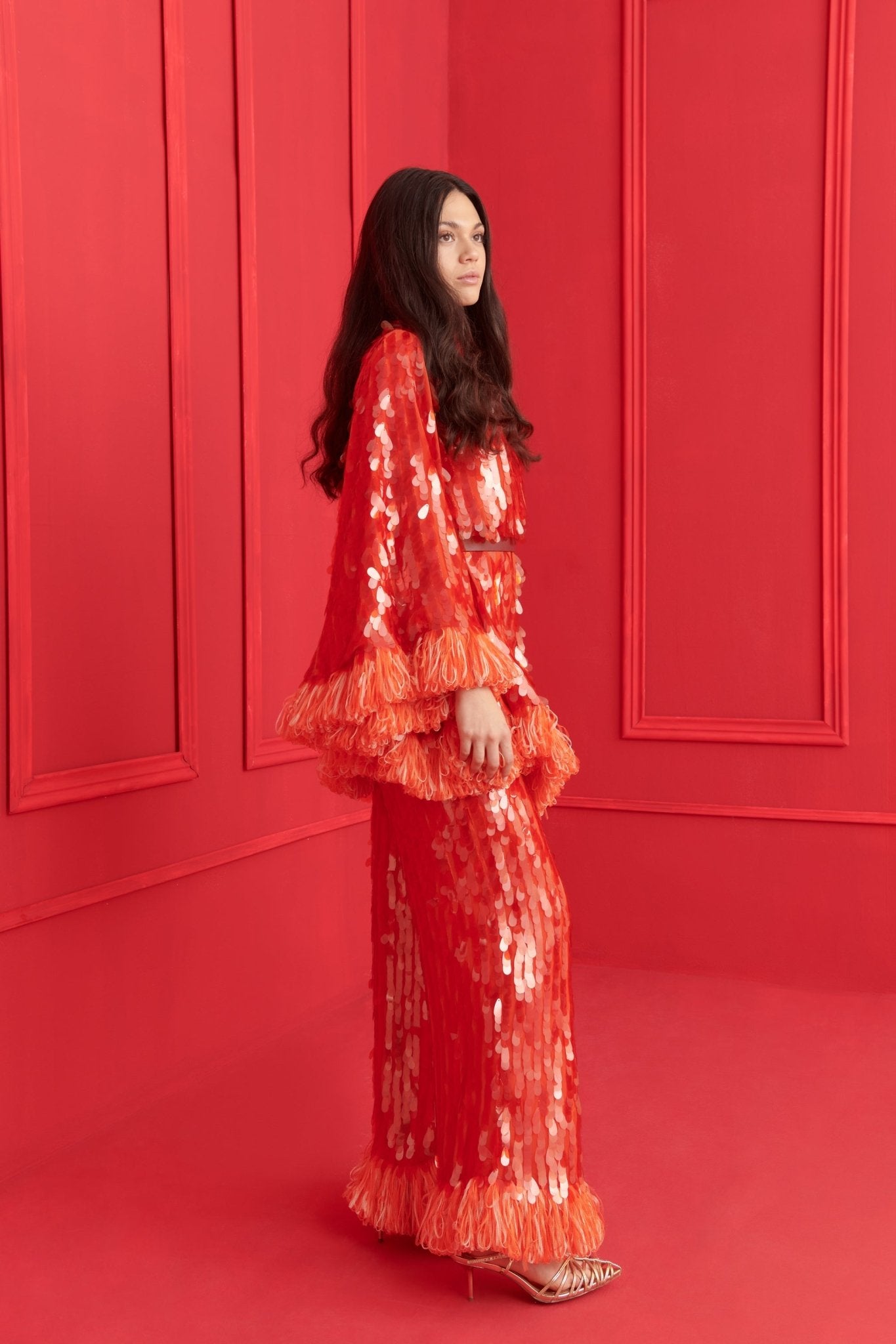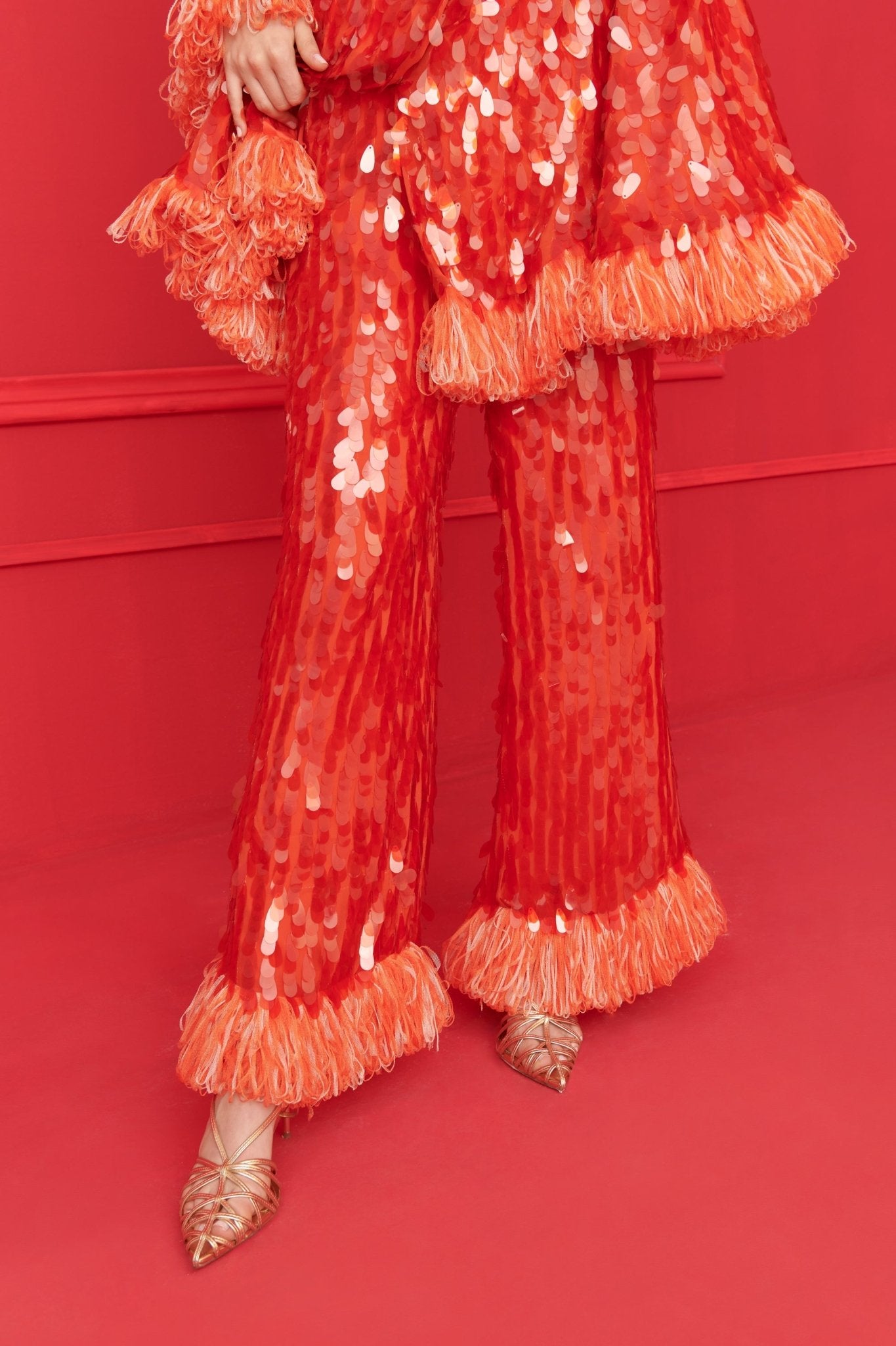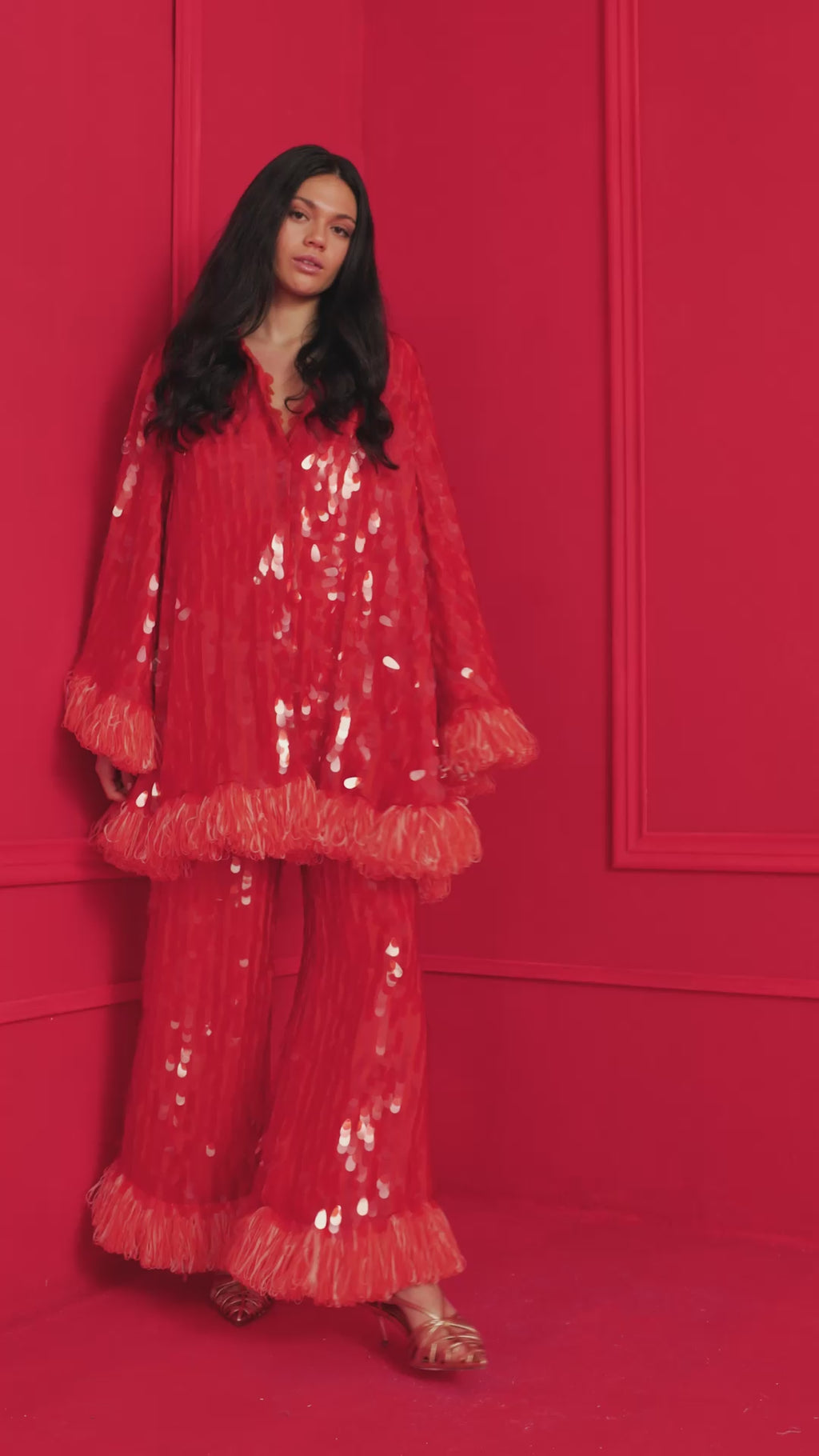 Los pantalones Ayla están hechos para brillar. Con un corte ancho y completamente adornados con llamativas lentejuelas rojas, resplandecen con cada movimiento. Su ribete de flecos en el dobladillo les da un toque extra de estilo y movimiento, convirtiéndolos en la prenda perfecta tanto para la pista de baile como para la alfombra roja. Lleva, además, cremallera en el lateral.