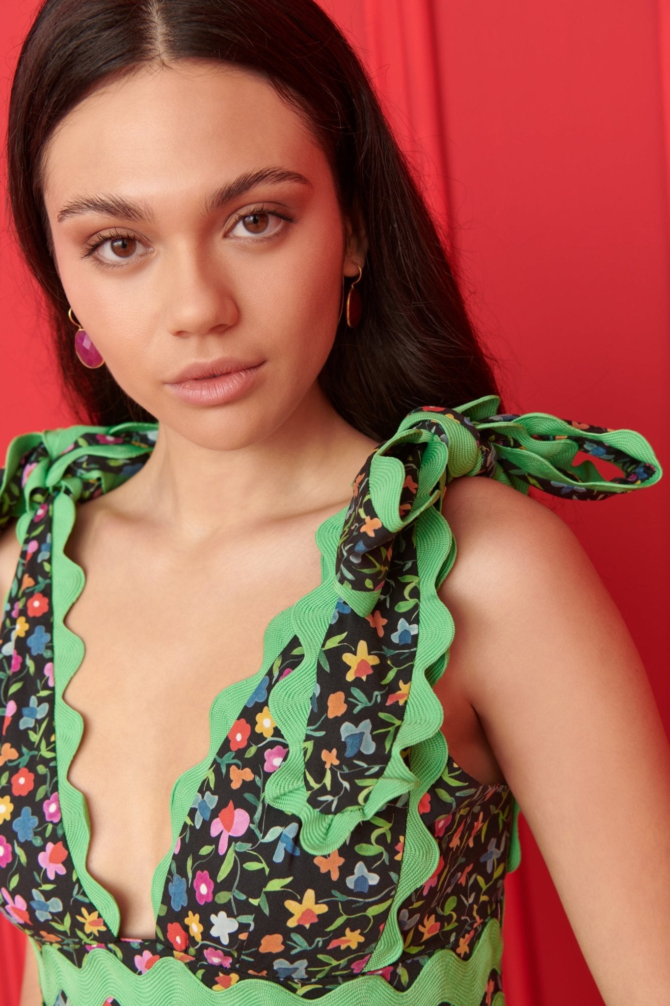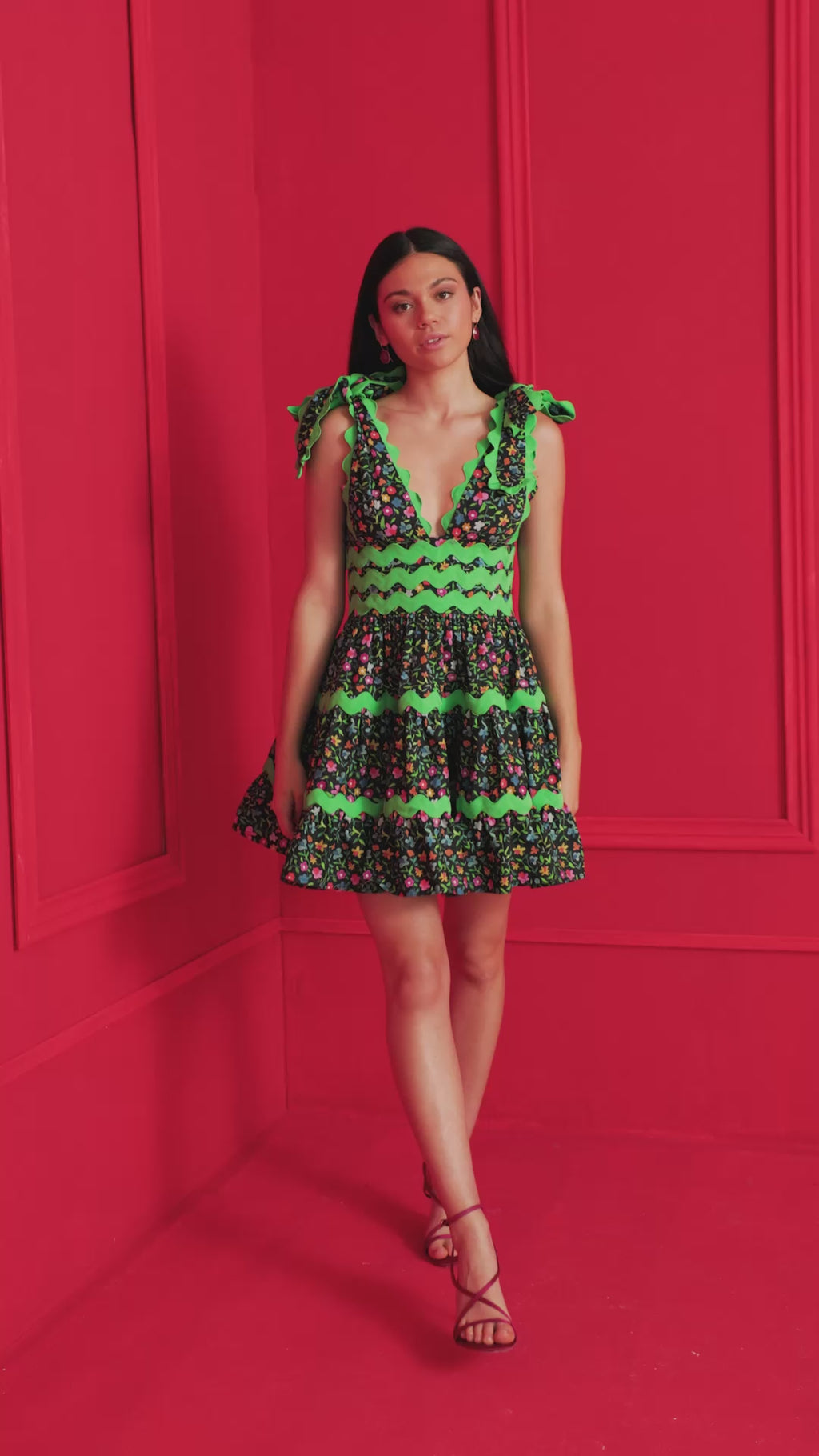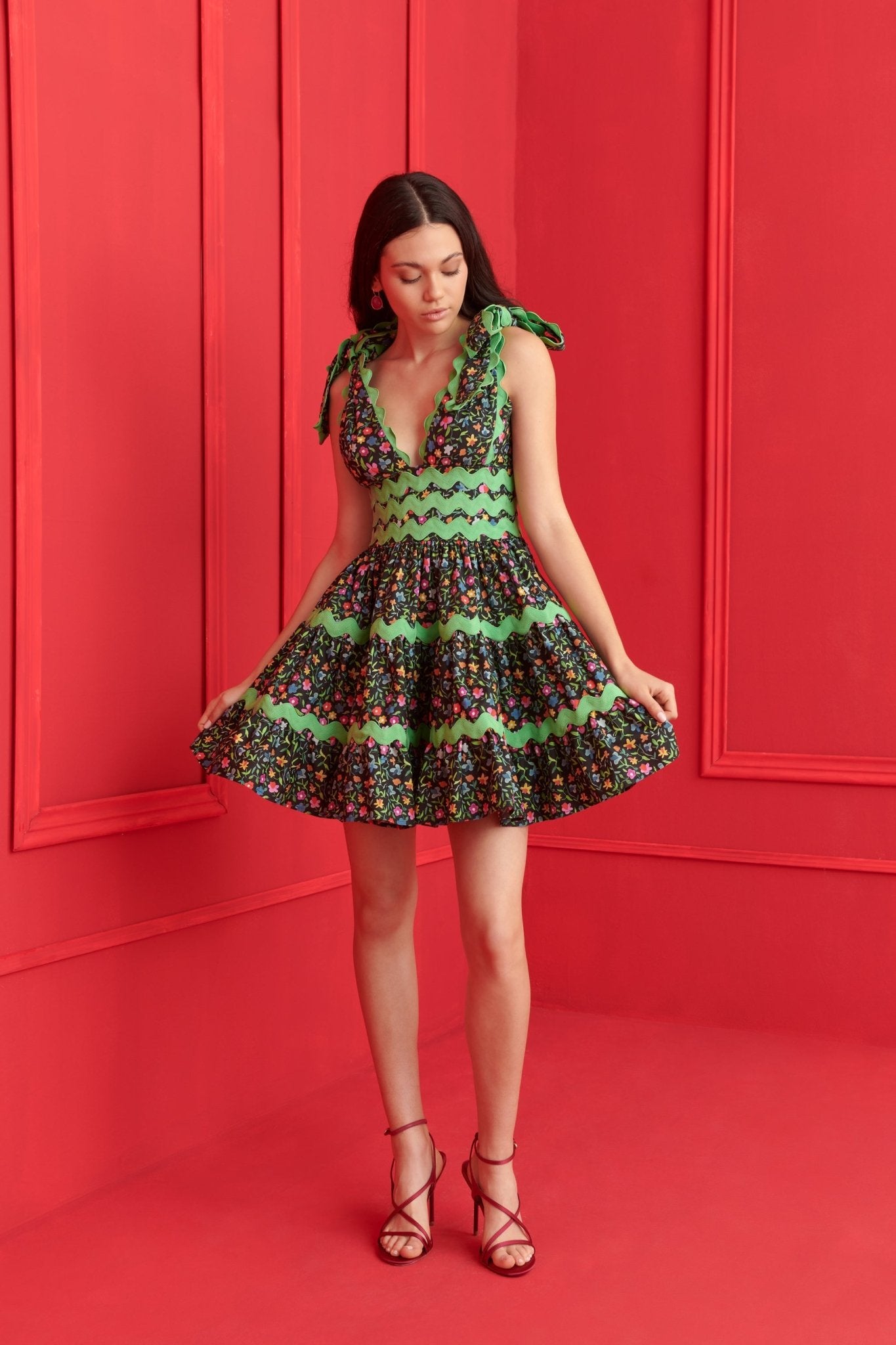 Divertido, atrevido y lleno de estilo. El vestido Cheli es una oda a las noches de verano, con un vibrante ribete verde y un estampado floral caleidoscópico. Su falda escalonada y su escote en V crean una silueta llena de movimiento y encanto. Con tirantes ajustables en los hombros, es perfecto para bailar toda la noche o alegrar un paseo diurno.