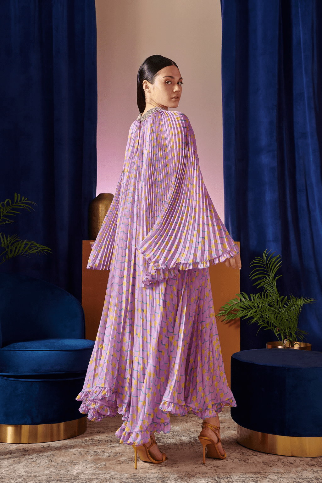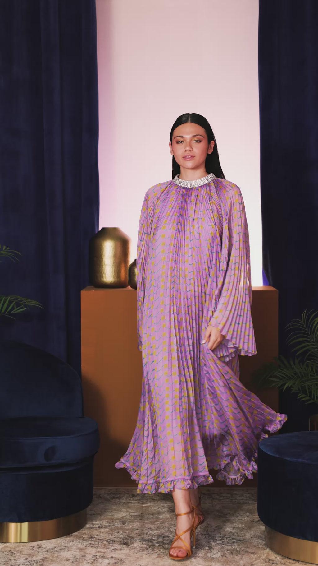 Este vestido es un torbellino de color y movimiento que destaca por su silueta plisada y fluida. Confeccionado con un tejido ligero y vaporoso con estampado pastel de ondas en lila, amarillo y turquesa, irradia elegancia natural y puede llevarse indistintamente por cualquiera de sus dos lados. El brillo del cuello lo hace perfecto para bodas, fiestas de verano o cualquier momento que requiera un toque de magia. Atrevido pero elegante, este vestido es una prenda que nunca pasa desapercibida.