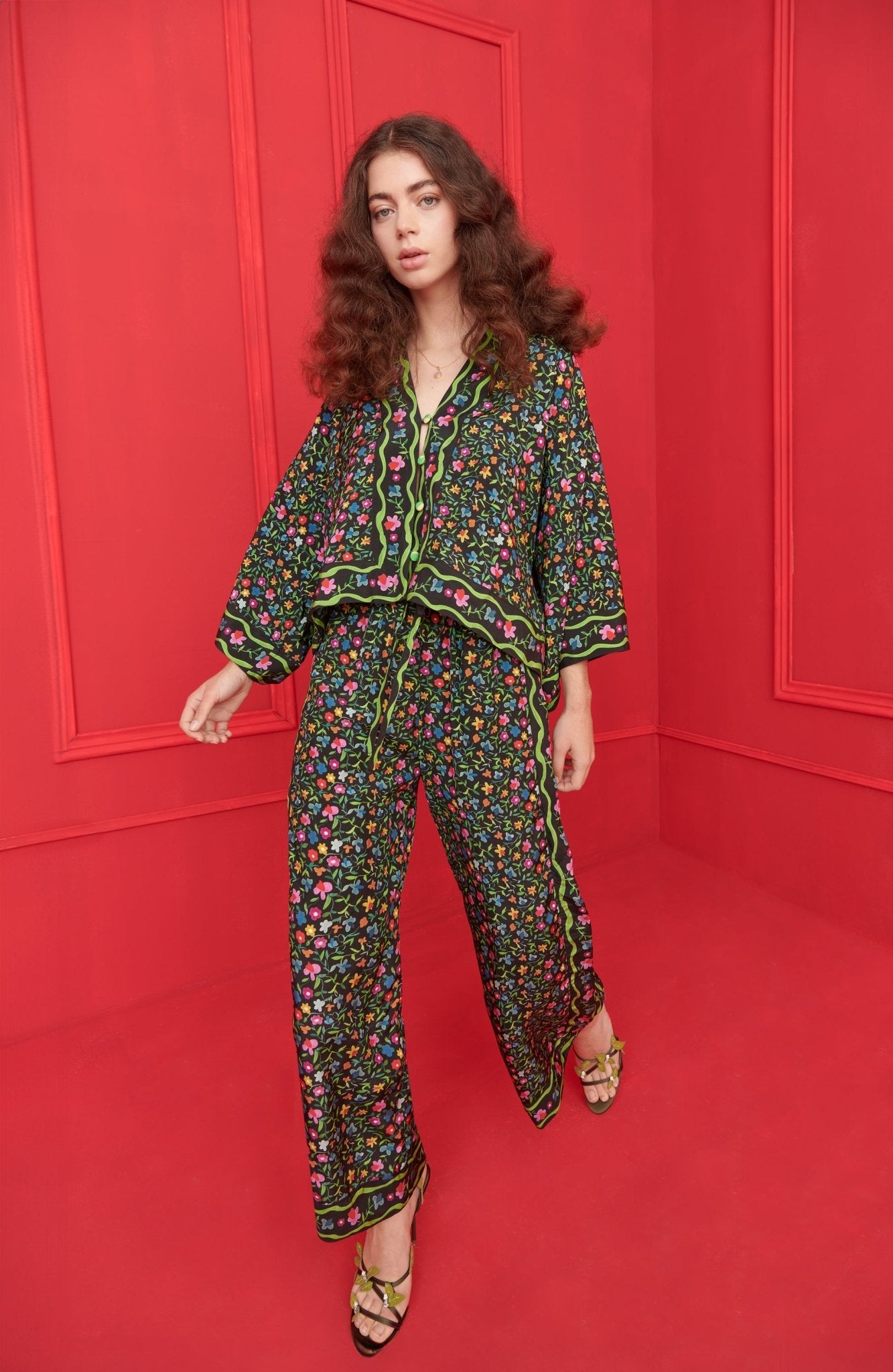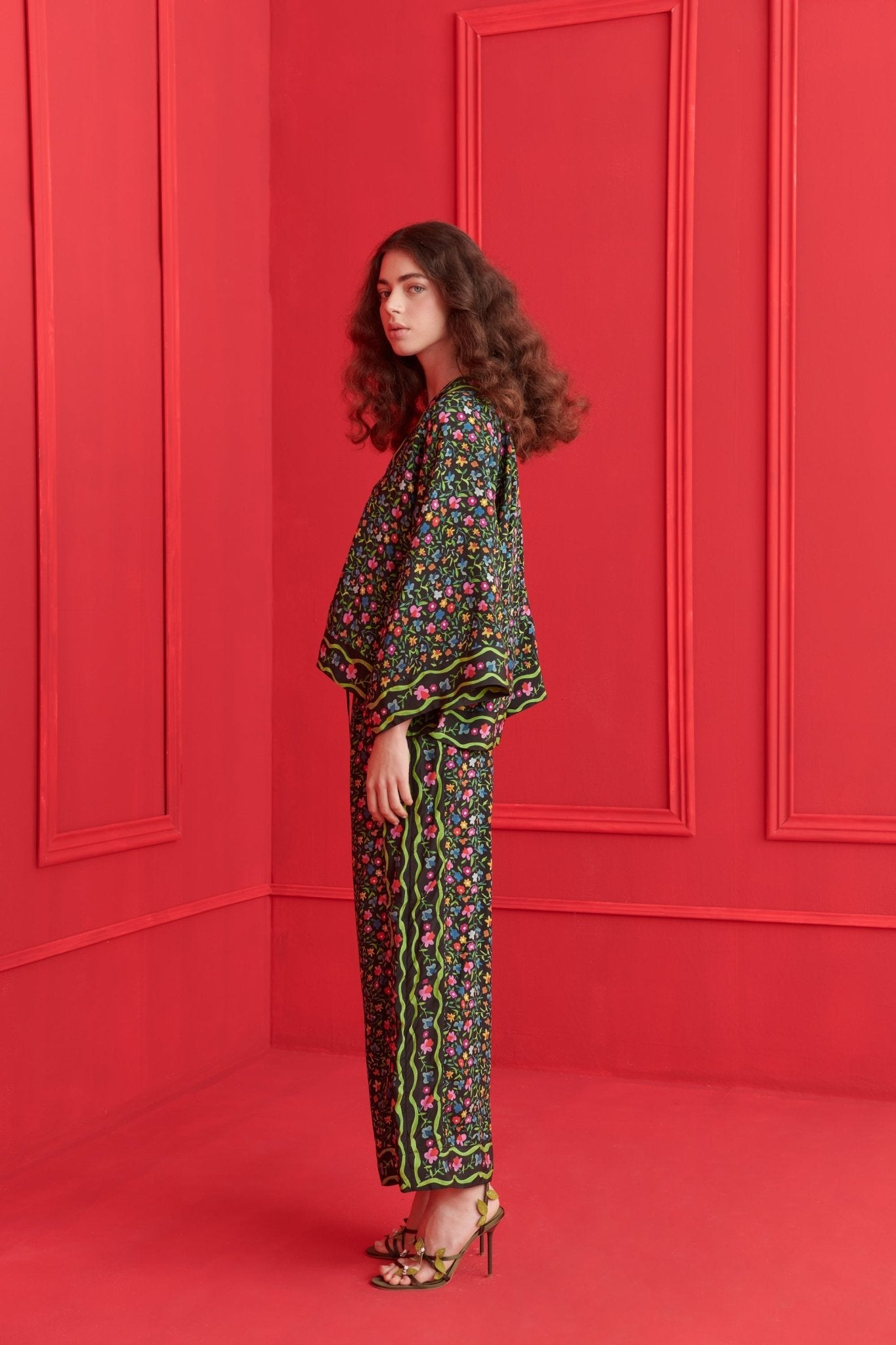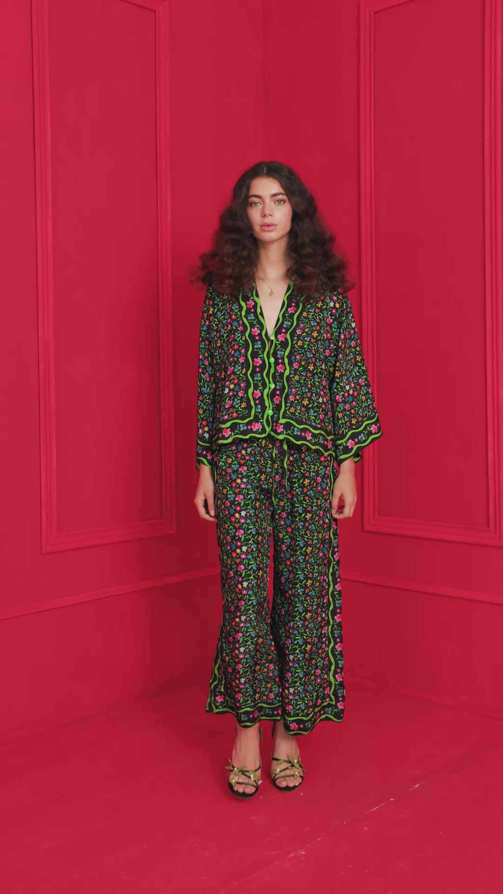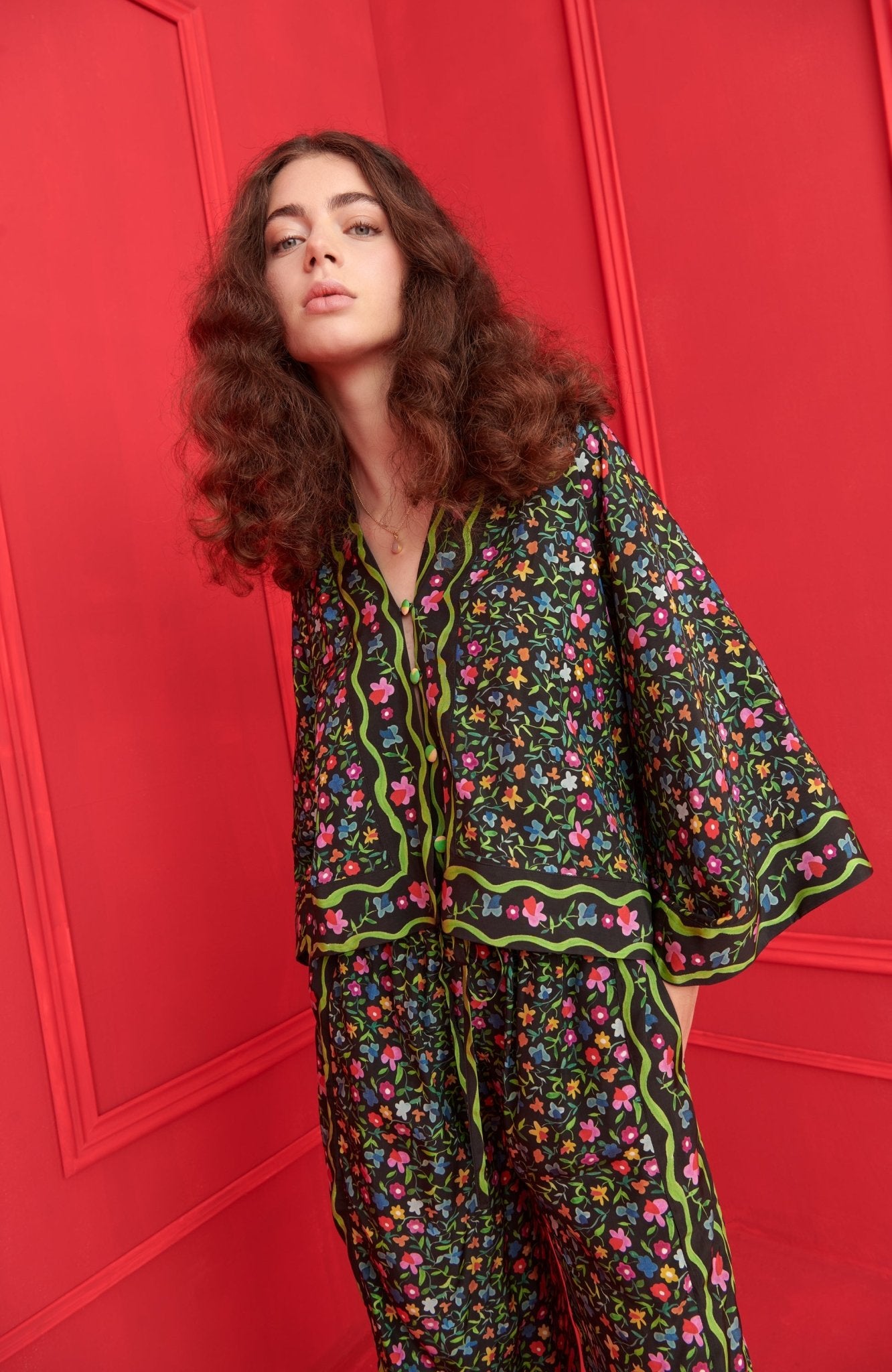 El Hala Top, una propuesta diferente de ropa informal, combina una silueta fluida con encanto botánico. Diseñado con mangas anchas y un escote en V abotonado en la parte delantera, presenta un exuberante estampado floral ribeteado por vibrantes líneas verdes y fucsias que destacan sobre el fondo negro azabache. Combínalo con los Hala Pants a juego para crear un total look que no pasará desapercibido.