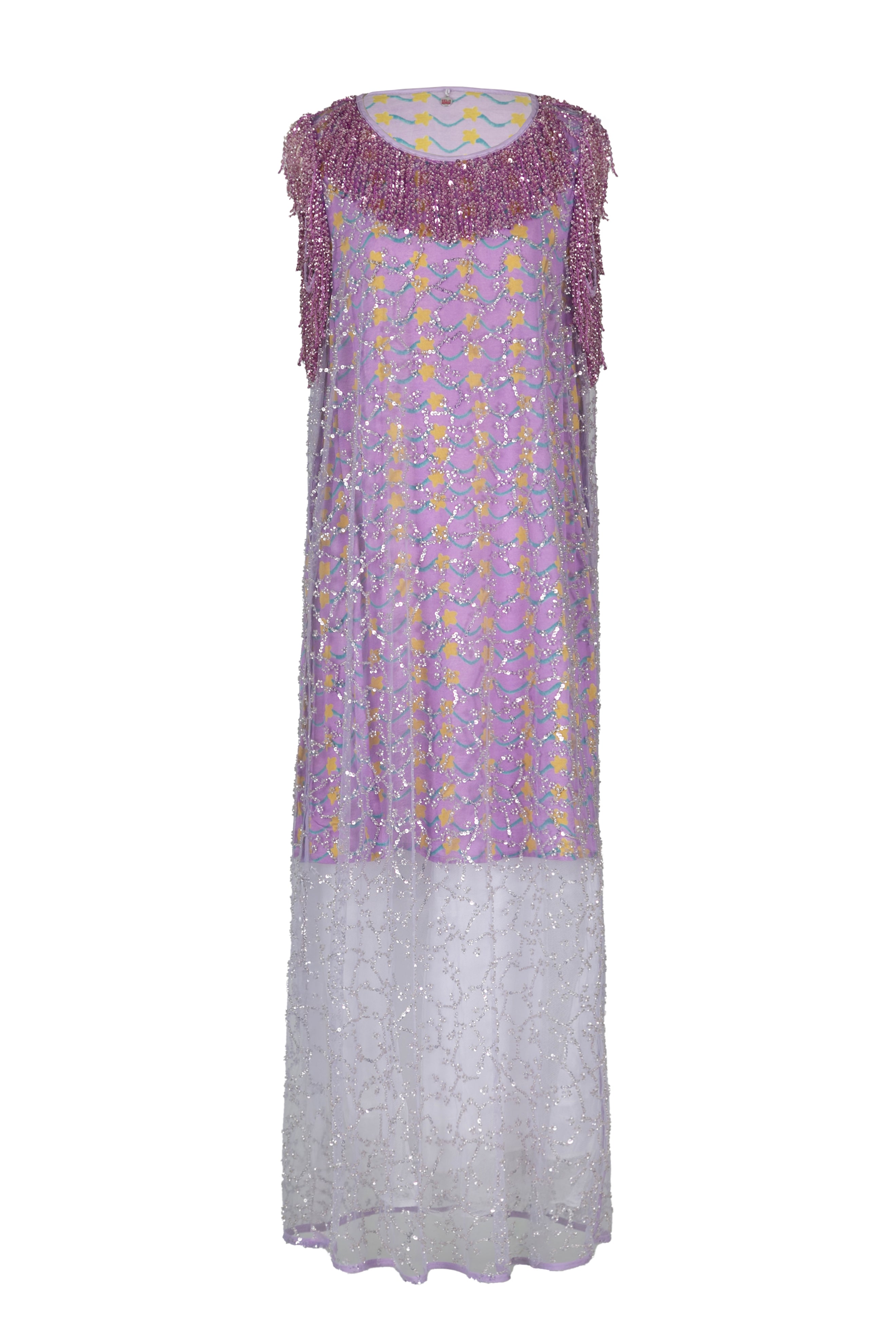 Déjate envolver por la noche con este vestido. De corte midi, sin mangas y transparente, el vestido Lunaria está adornado con brillantes abalorios y lentejuelas, sobre una base lila pastel con motivos florales. Su transparencia crea una silueta de ensueño, perfecta para veladas elegantes, bodas o eventos especiales en los que quieras brillar de forma sutil, pero innegable.