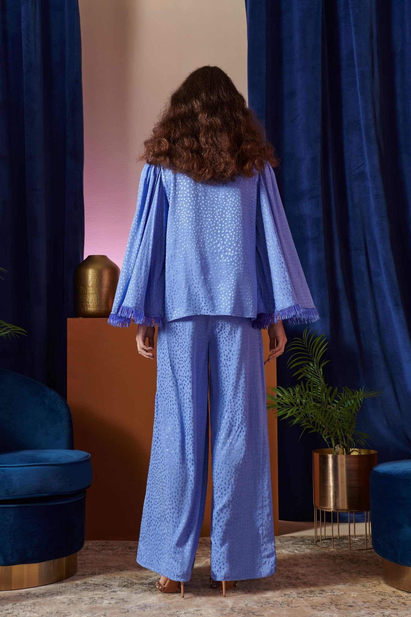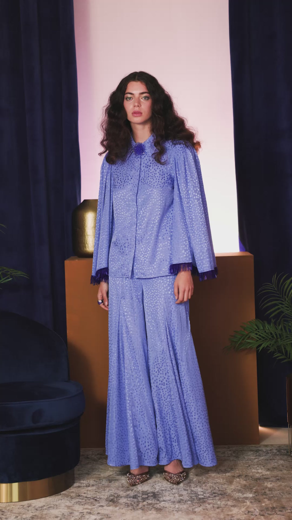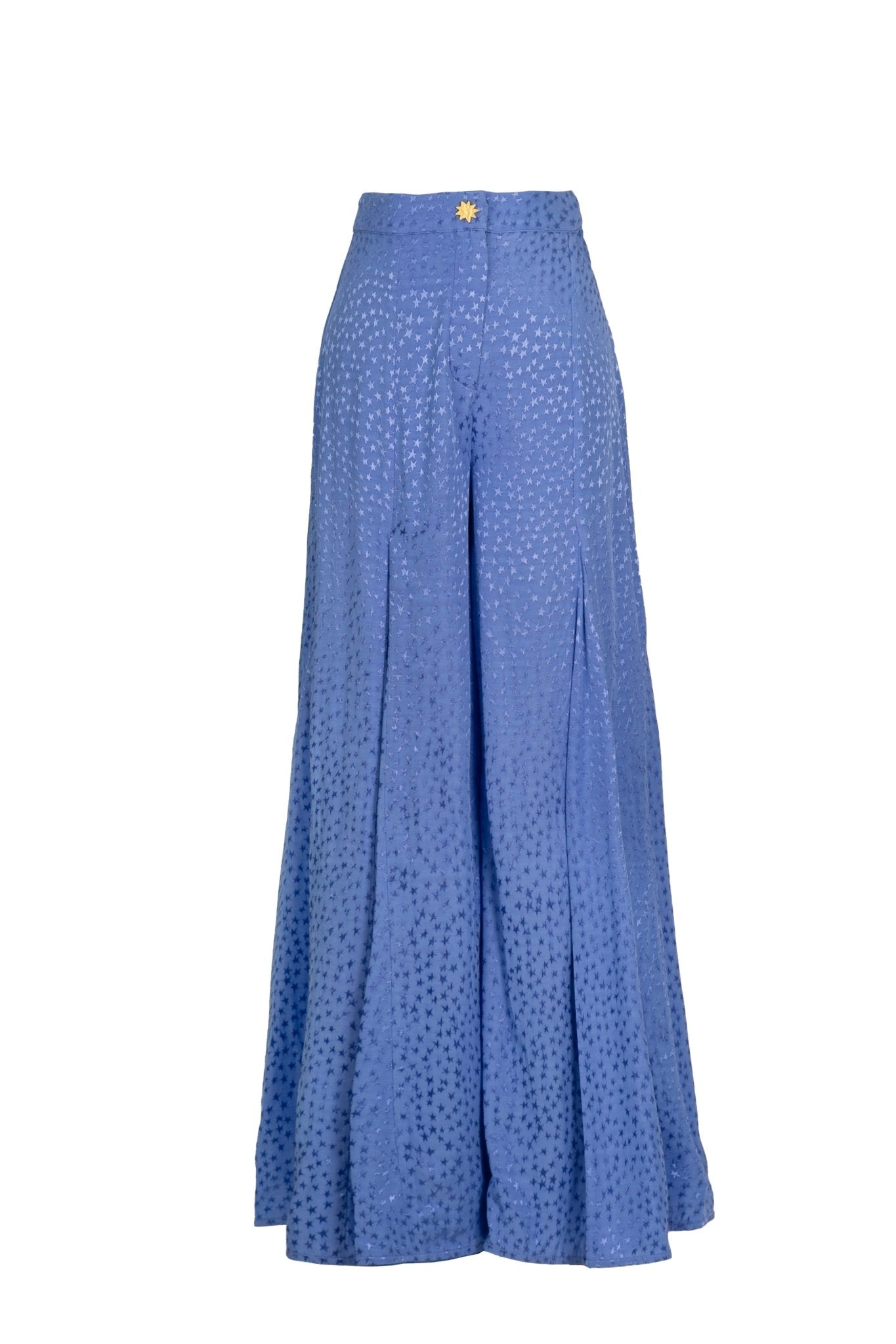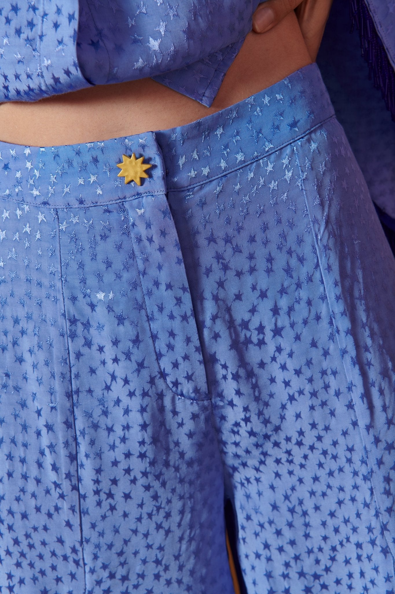 Luce un estilo único con los pantalones Lynx, confeccionados en un tejido azul claro brillante adornado con motivos de estrellas. Estos pantalones de pierna ancha presentan elegantes pliegues frontales que aportan movimiento y estructura, creando una silueta fluida a la par que elegante. Perfectos para ocasiones especiales, noches en las que quieras ir a la última o looks atrevidos de día. Rematados con un botón en forma de sol para un toque extra de estilo. Combínalos con el top Lynx a juego para un look cósmico completo.