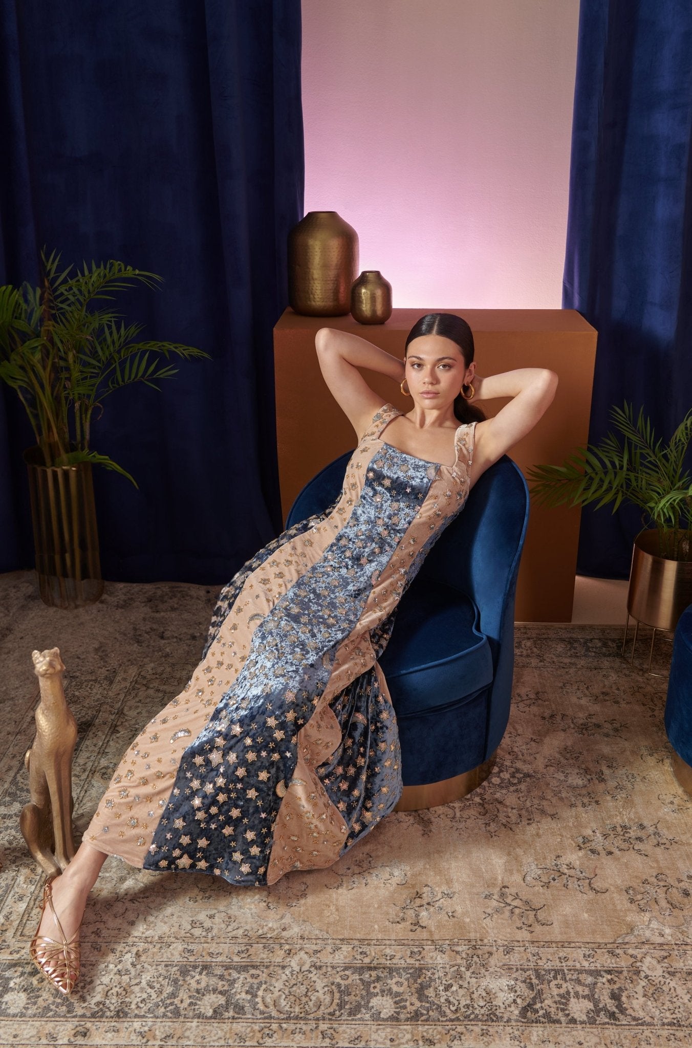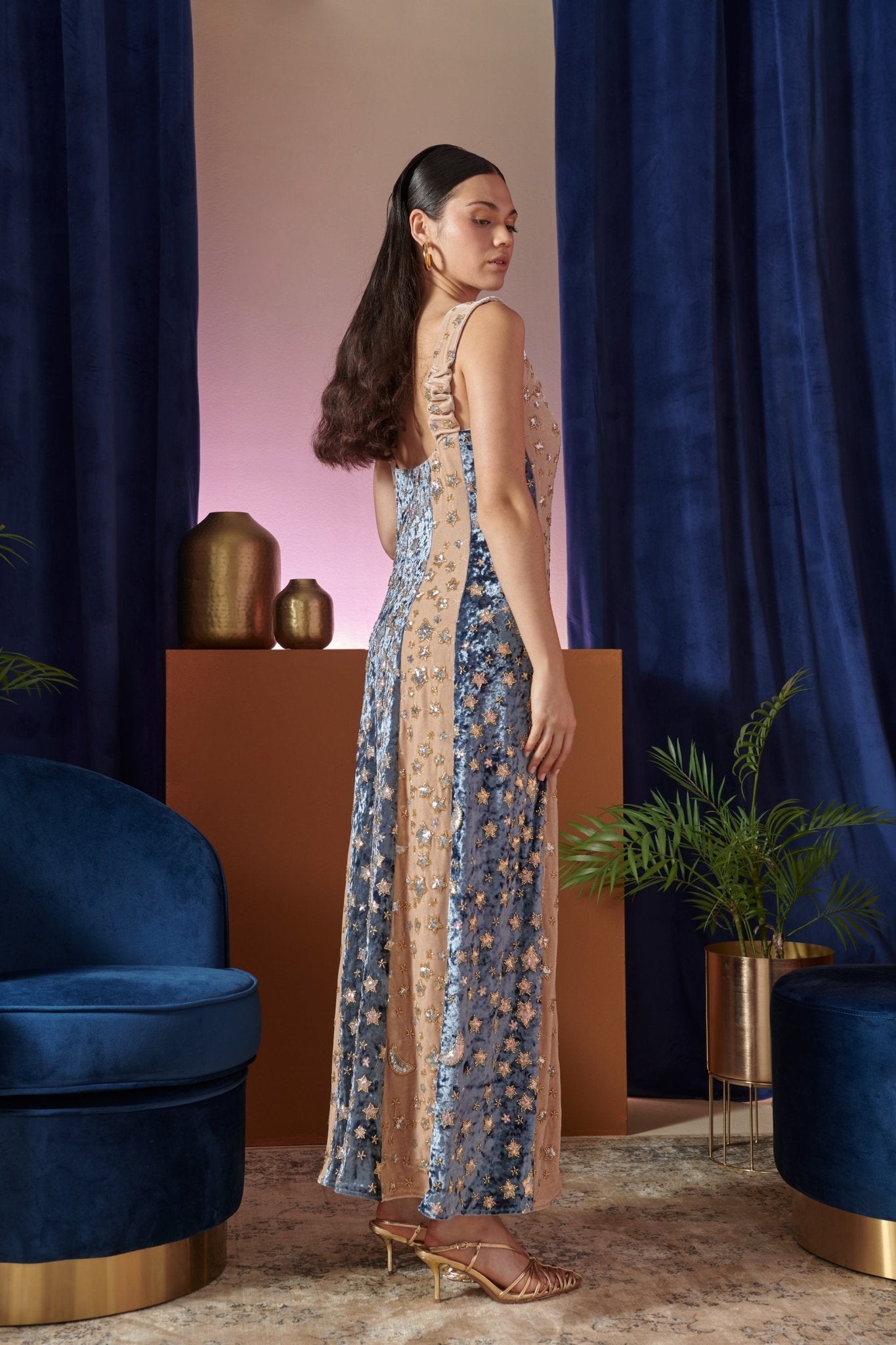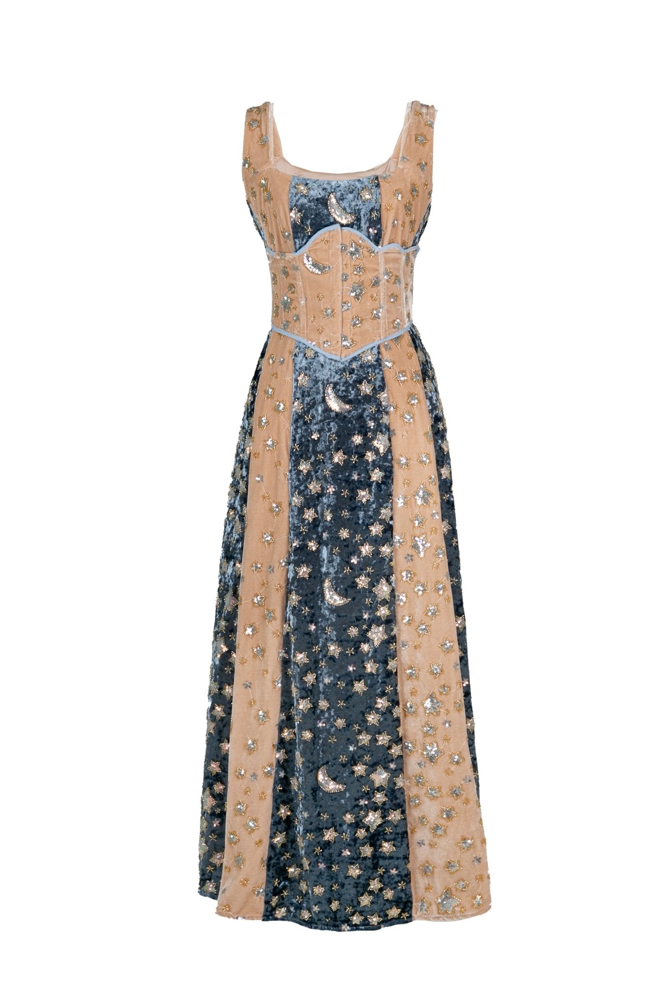 Con el vestido Noctis, serás el centro de todas las miradas. Esta prenda está confeccionada en terciopelo de gran calidad. Los paneles alternos en tonos azul medianoche y champán están bordados con estrellas y lunas brillantes, evocando la magia del cielo nocturno. El escote cuadrado y el corpiño ajustado dan paso a una favorecedora silueta en forma de A, perfecta para salidas nocturnas o para un look diurno un poco más atrevido. Elegante y atemporal.