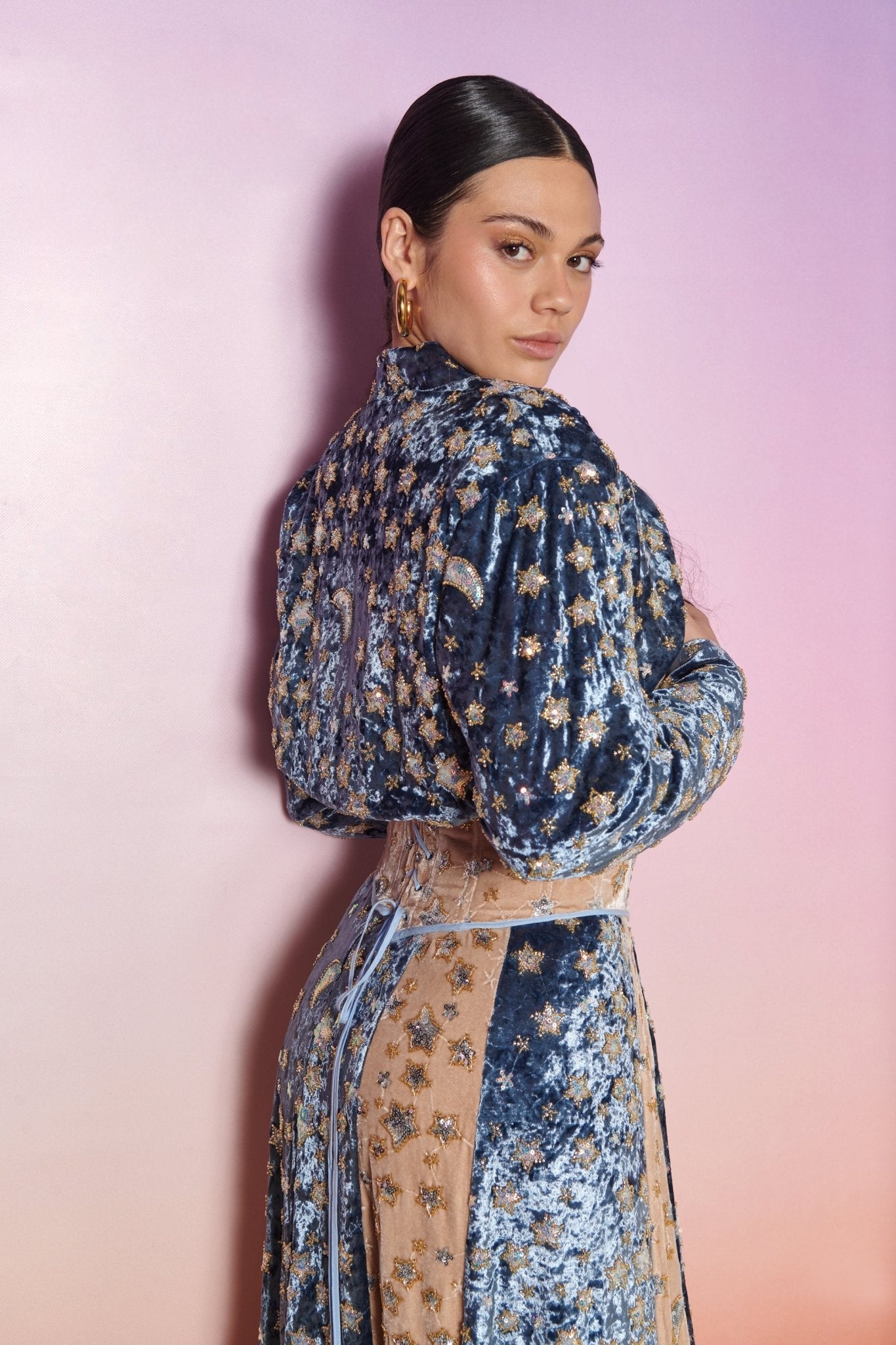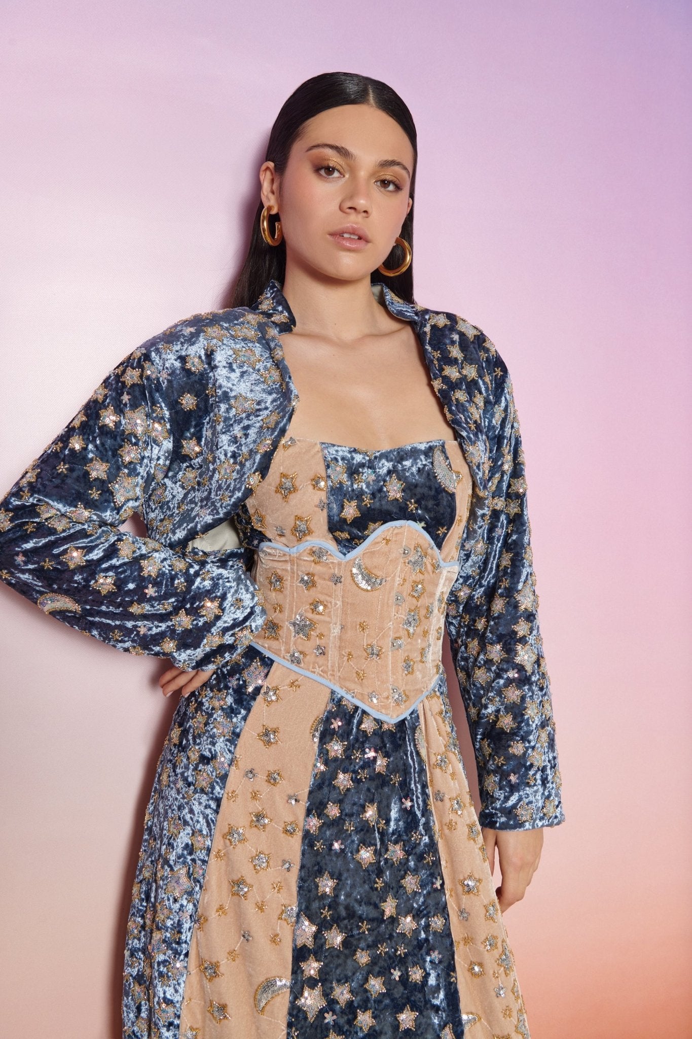 Déjate envolver por el cielo nocturno con la chaqueta Noctis. Confeccionada en suave terciopelo azul medianoche, esta prenda de manga larga está bordada con deslumbrantes estrellas y lunas que brillan con cada movimiento. Su corte estructurado le aporta elegancia y personalidad, ideal para combinar con vestidos o para realzar unos jeans de diario. Abierta por delante y corte ajustado.
