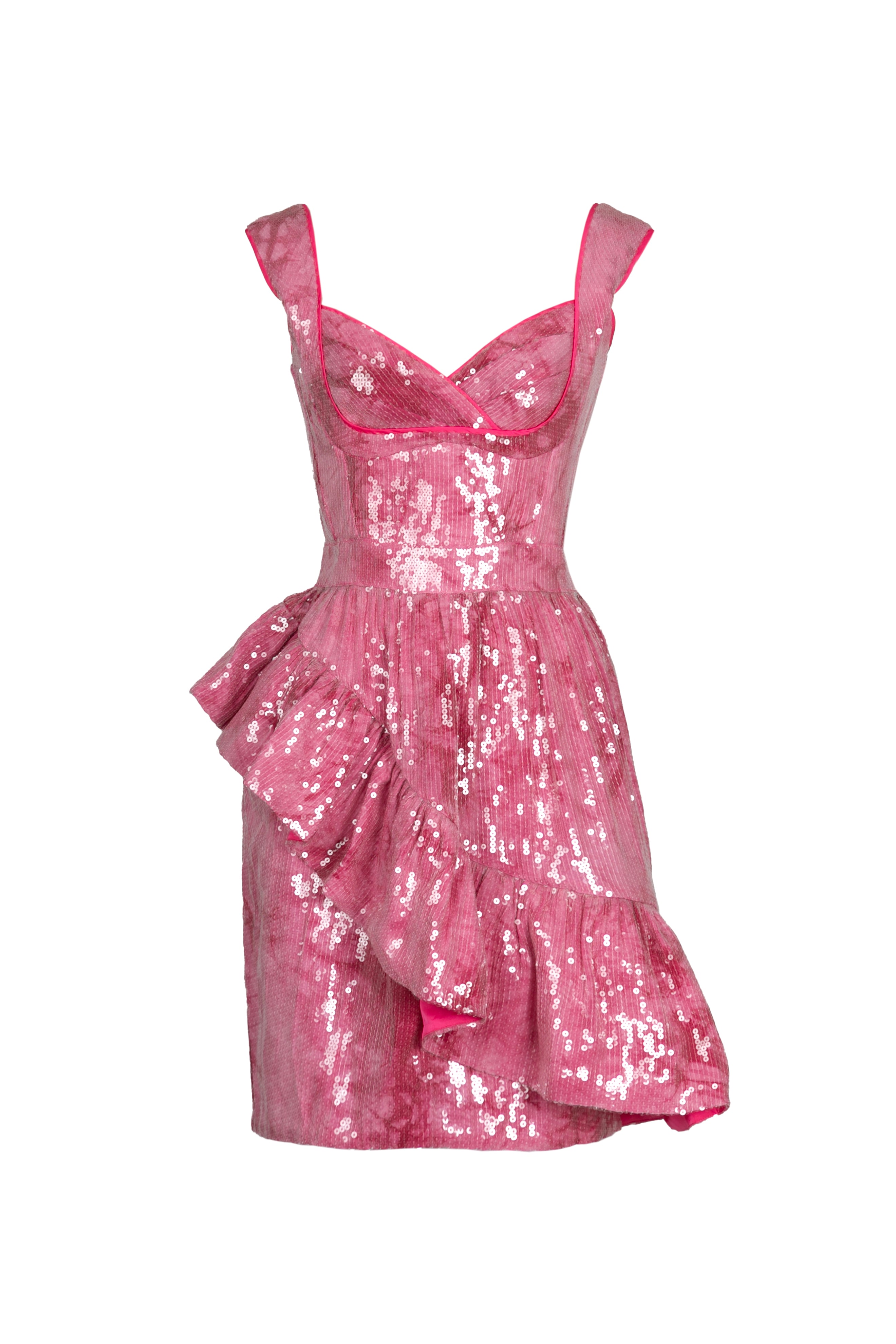 El vestido Nova, ideal para cualquier fiesta, está confeccionado con un tejido rosa brillante que refleja la luz en cada movimiento. Su corpiño ajustado y su escote corazón realzan la figura, mientras que el corte peplum asimétrico le aporta dramatismo y movimiento. Es perfecto para bodas, fiestas o cualquier noche que requiera brillo.