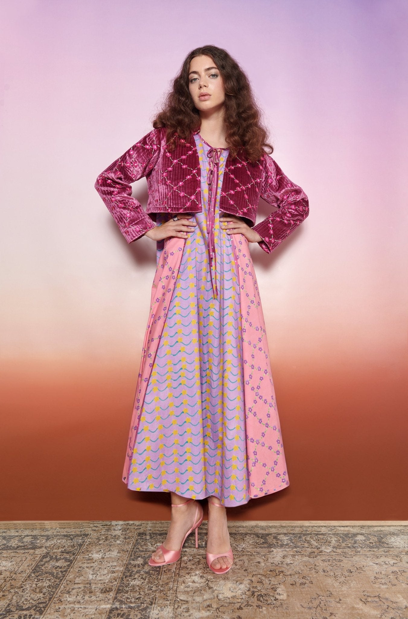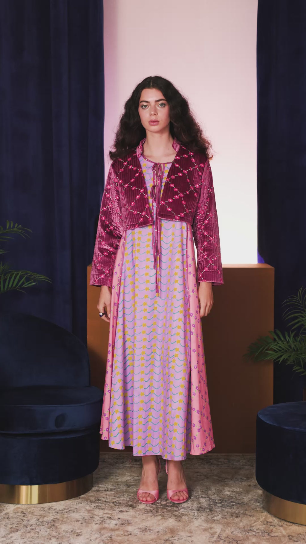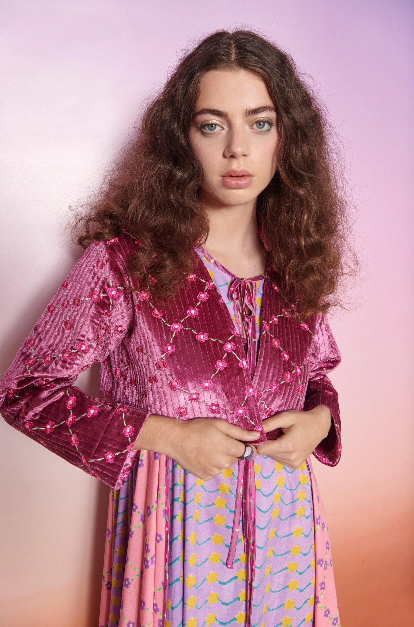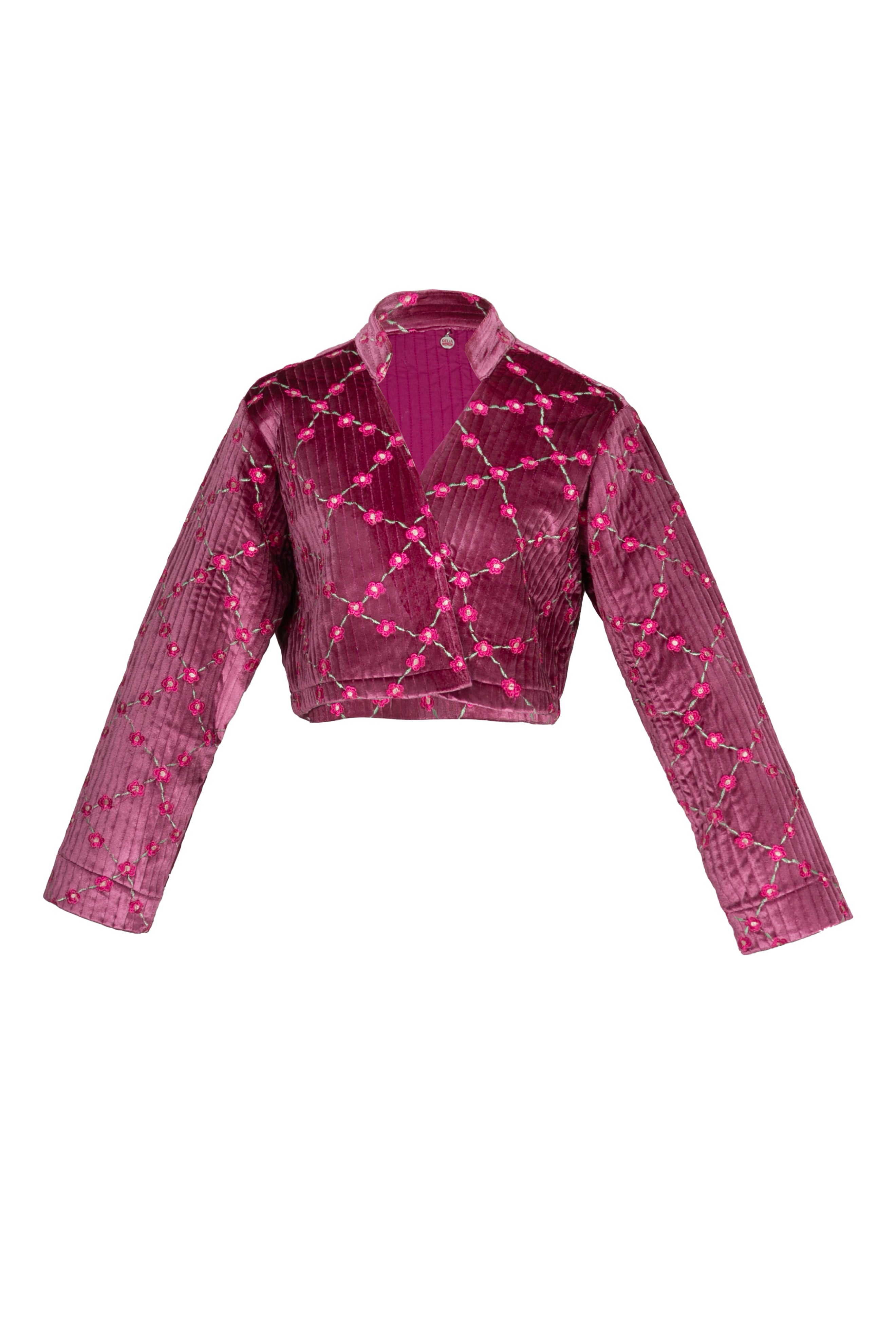 Un toque de lujo estelar. La chaqueta Perseus está confeccionada en suave terciopelo morado acolchado con delicados bordados florales que captan la luz y realzan cualquier look. Su silueta corta y estructurada es perfecta para añadir contraste a tus outfits diarios, y el cierre frontal con enganche acentúa su encanto. Una prenda imprescindible para el entretiempo que combina romanticismo y carácter.