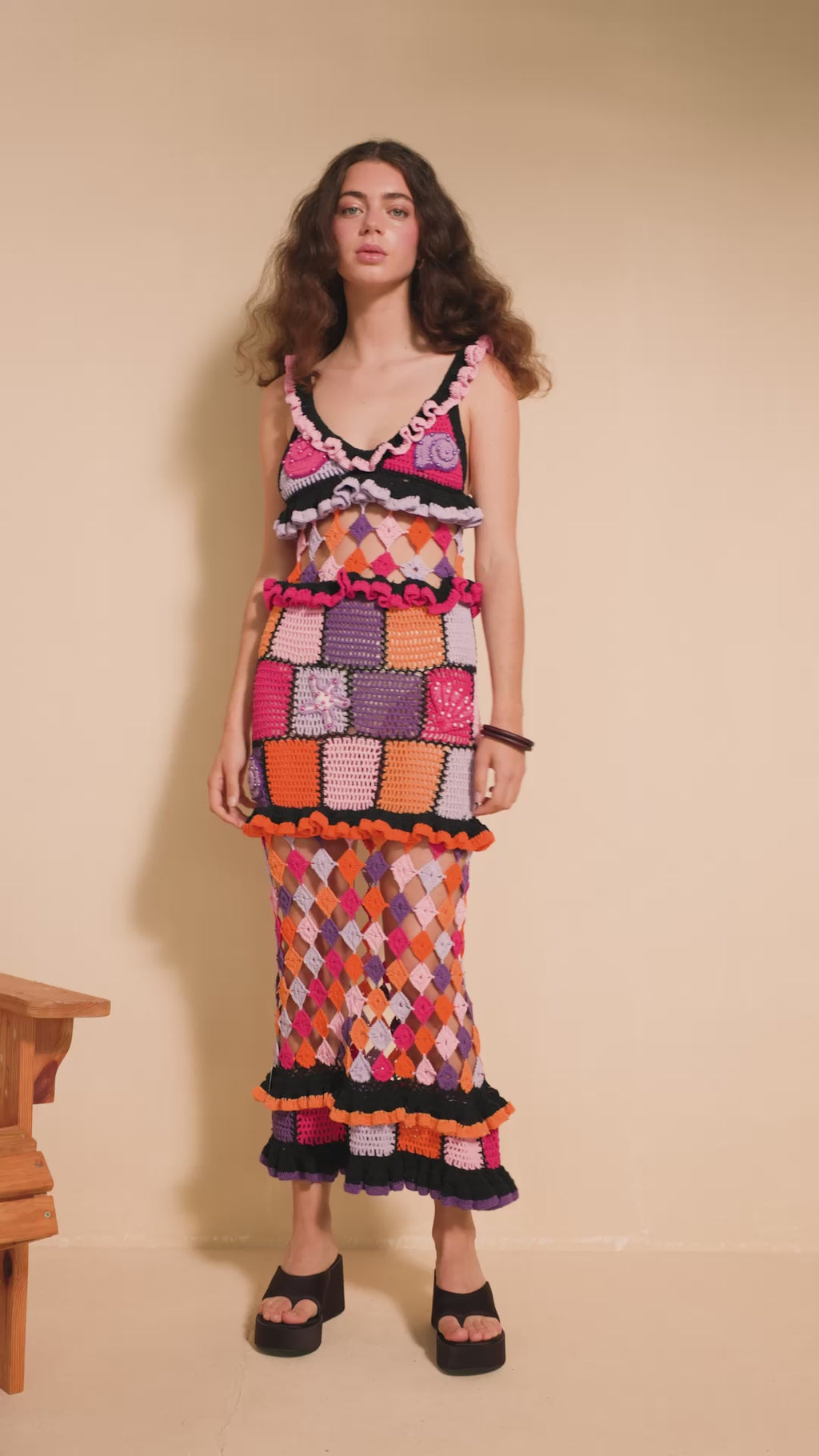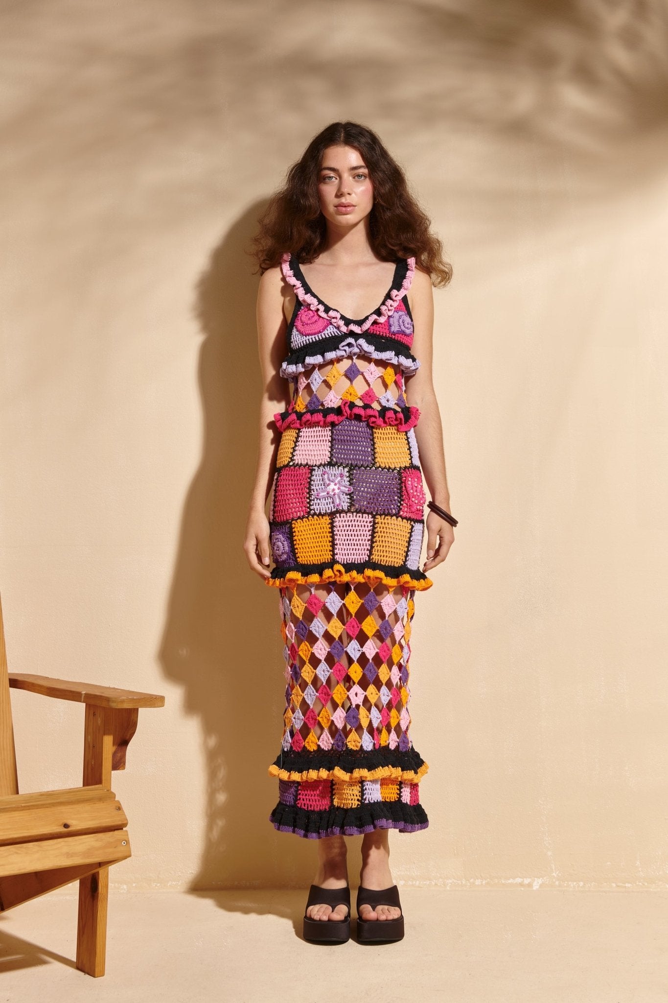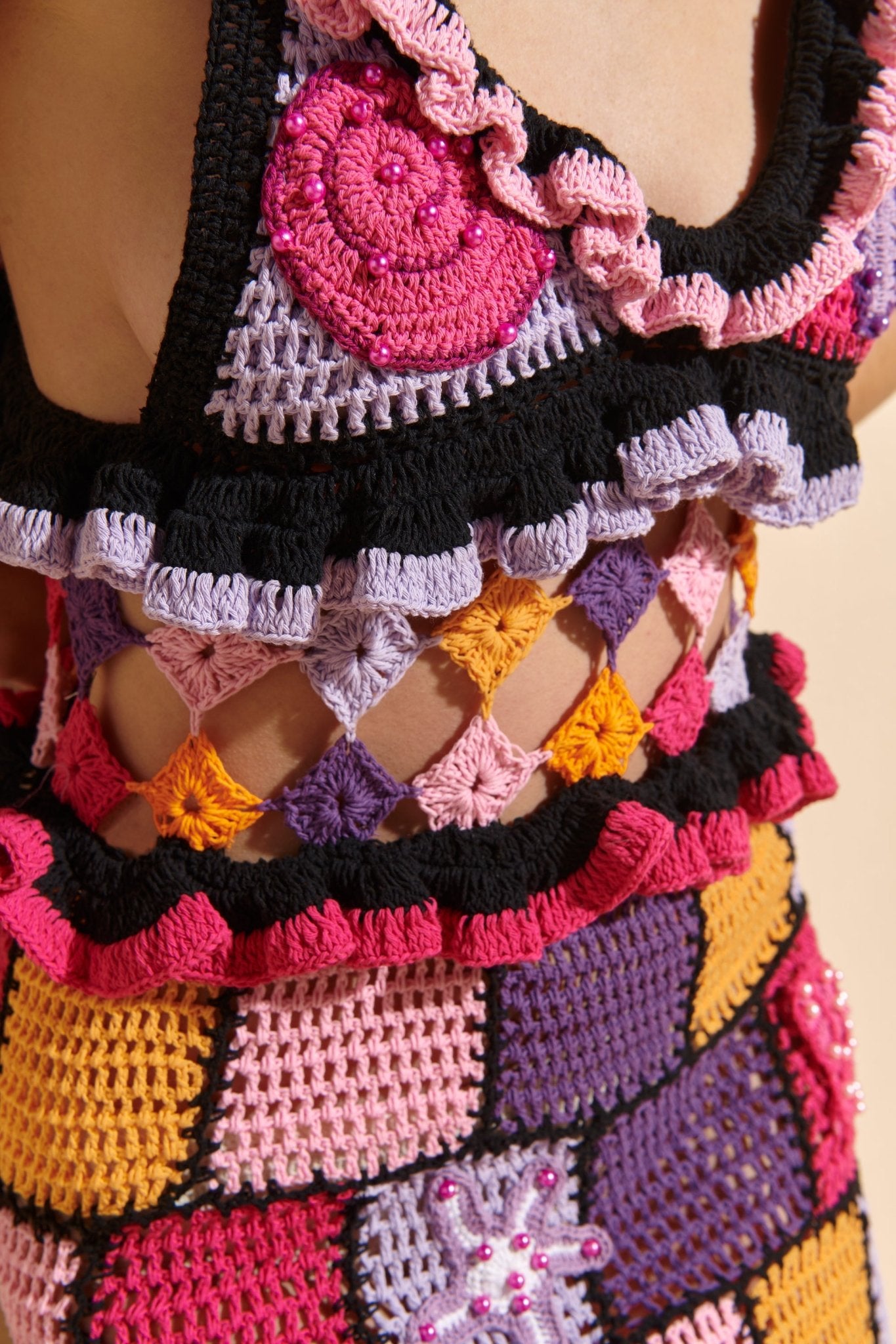A showstopper from every angle, the Saturn Dress is a patchwork fantasy come to life. Hand-crocheted in bold squares and diamonds of magenta, orange, black, and yellow, it plays with contrast and texture like no other. Ruffled trims accent the neckline, hips, and flared hem, while the open lattice skirt adds a hint of drama and skin. With a deep V-neck and spaghetti straps, you will be the center of attention with this piece!