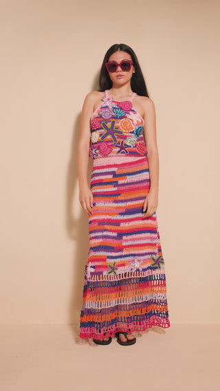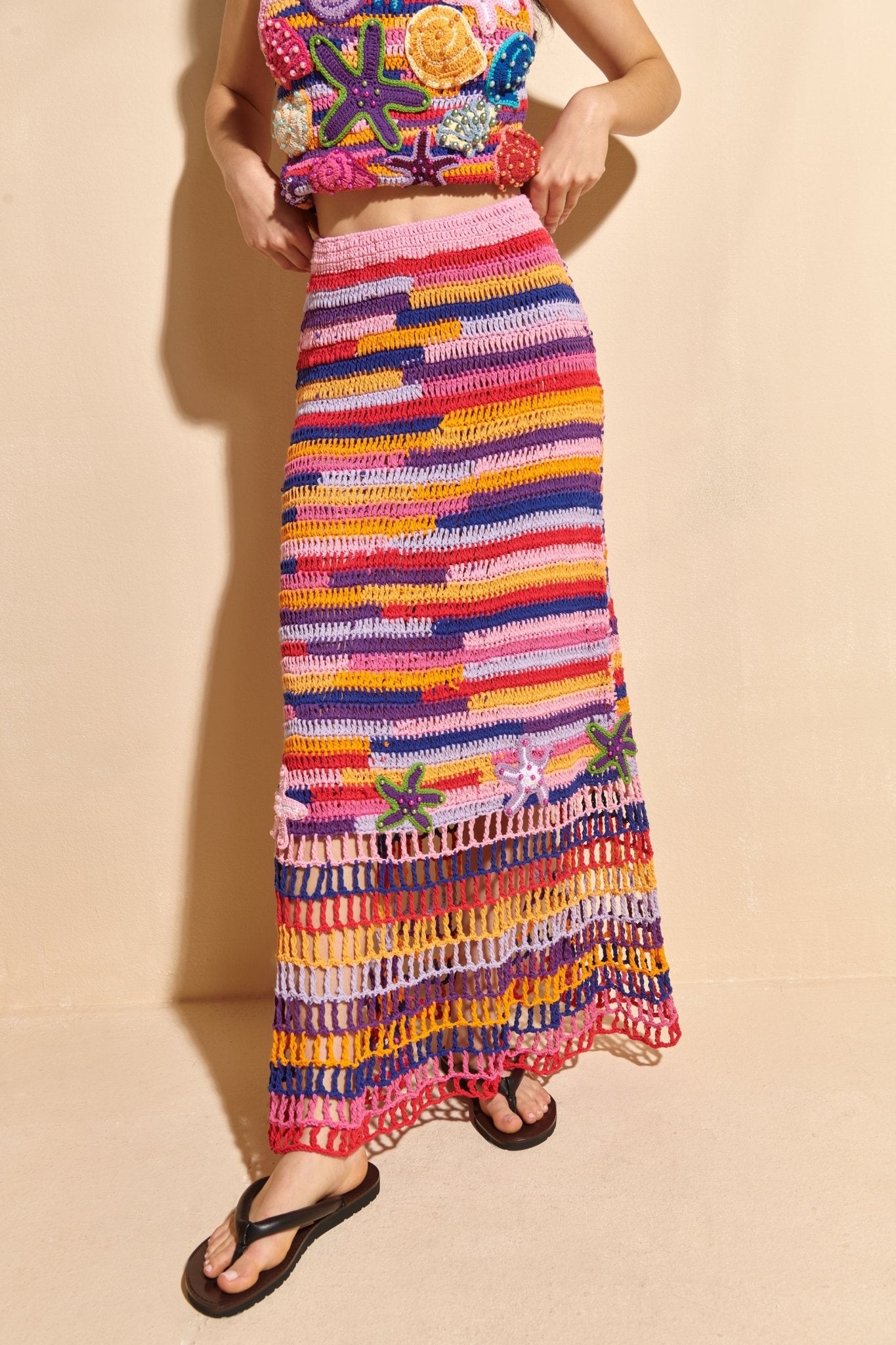Vibrant, breezy, and unmistakably bold, the Venus Skirt is a crochet masterpiece. Handwoven in a rainbow palette of saturated stripes in pinks, oranges and blues, it features a flared hem with peekaboo stitching and a constellation of playful starfish appliqués. The mid-rise, pull-on fit is easy and flattering, hugging the hips before loosening into a flowy silhouette.