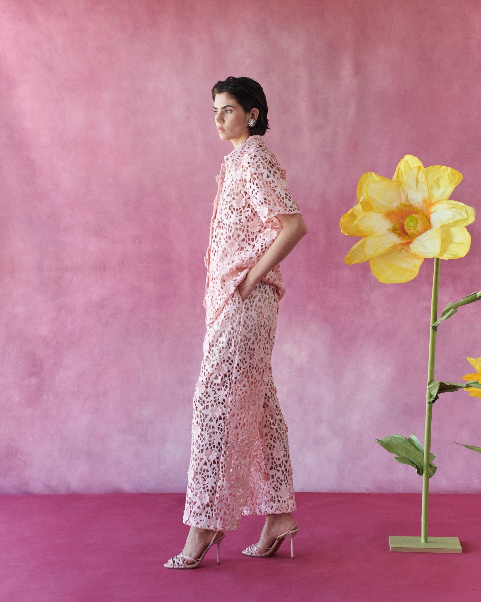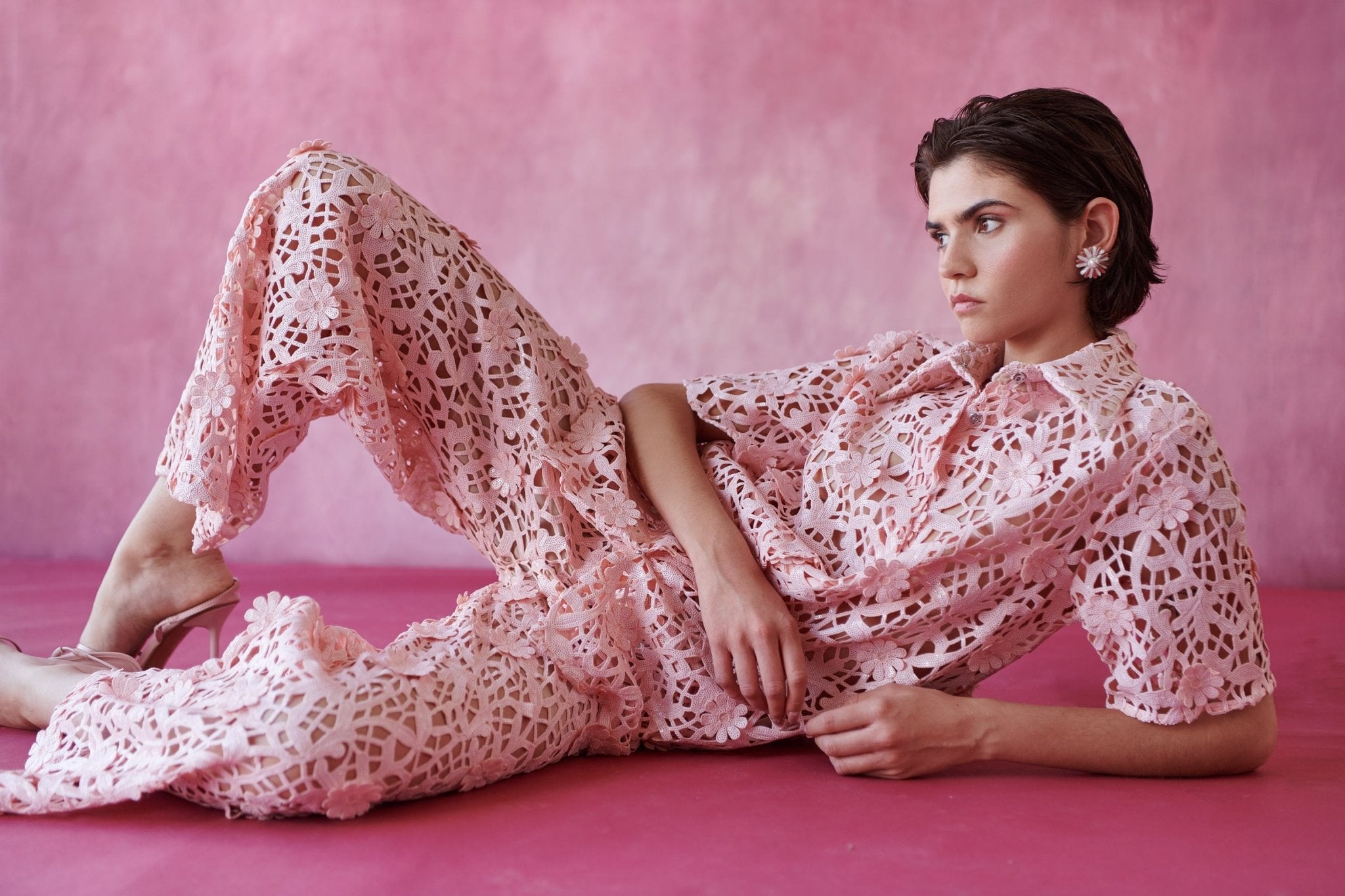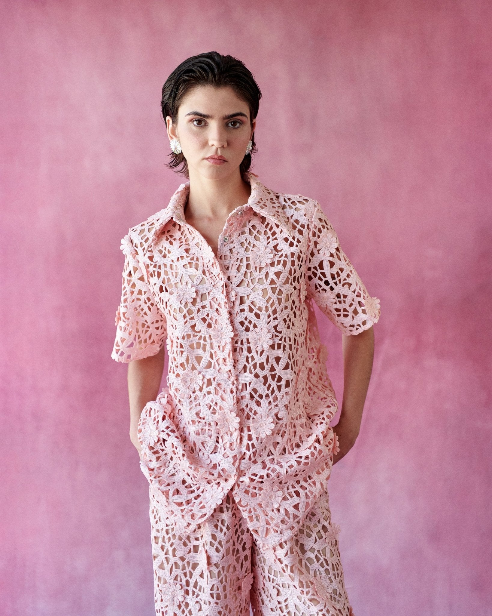 Un top especial confeccionado en encaje floral con lentejuelas que aportan brillo. El tejido, con relieve floral, añade textura.