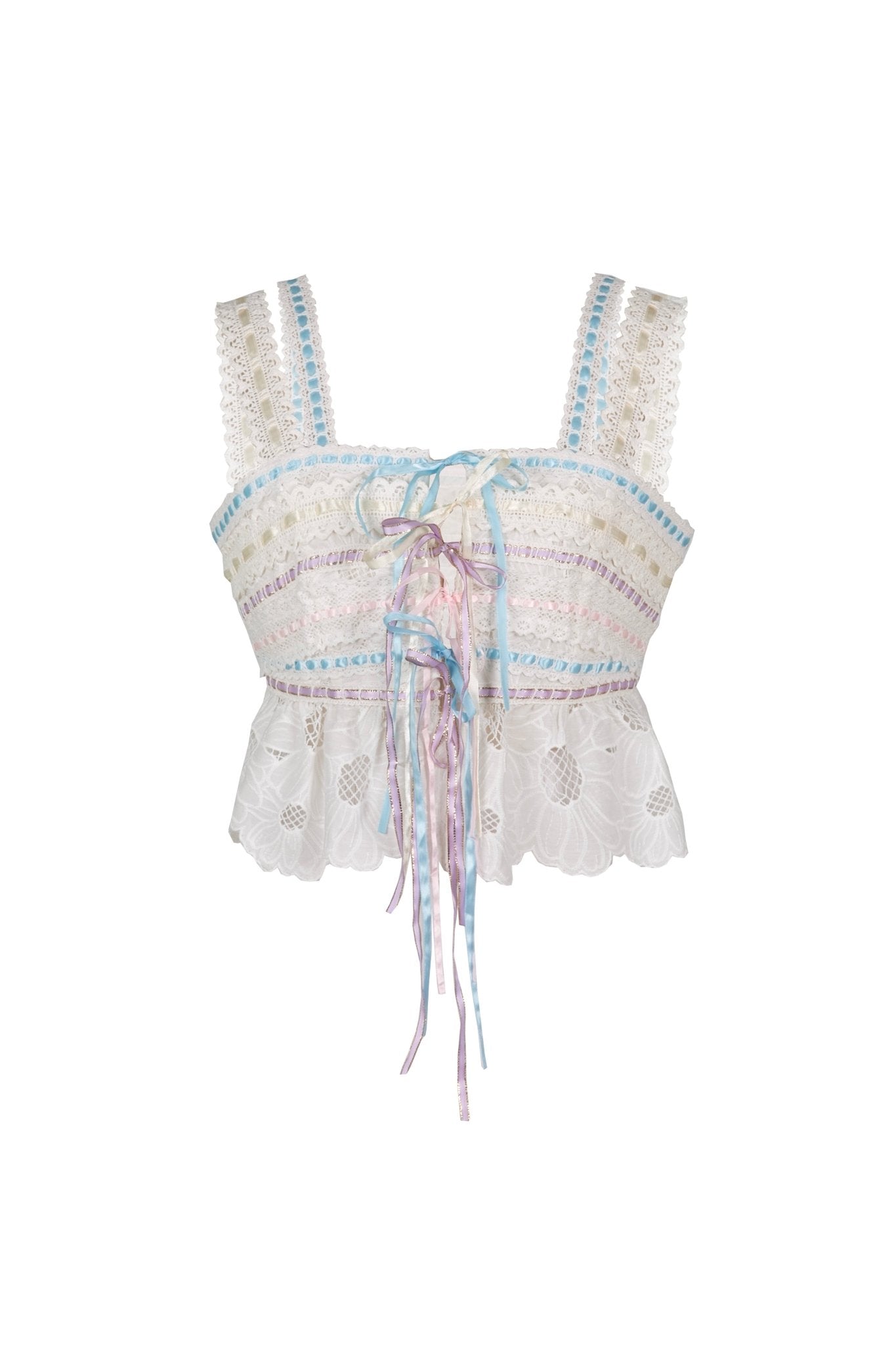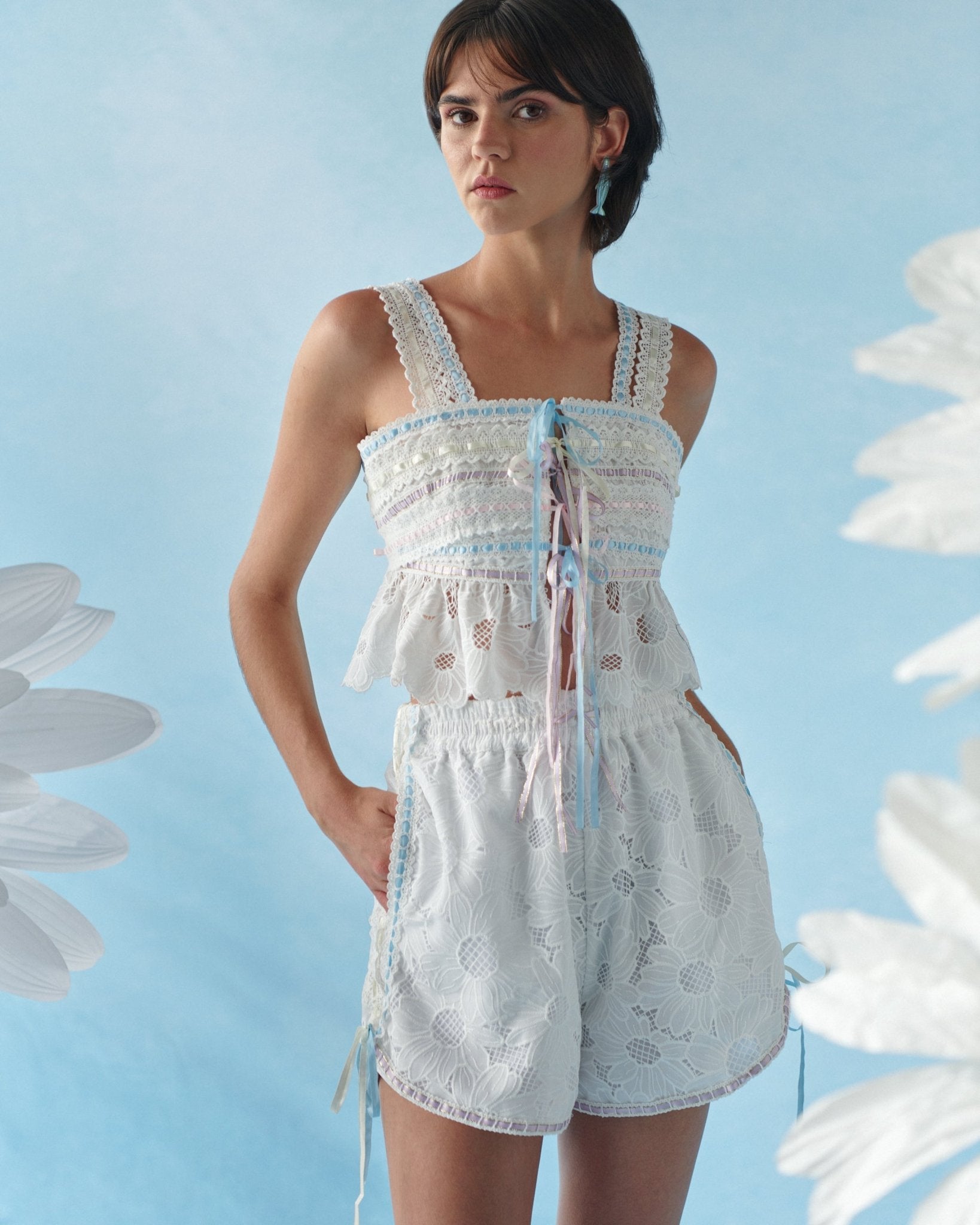 En encaje floral blanco, con pequeños lazos en el pecho y bajo ondulado que aporta textura. Lleva cremallera lateral para que siente bien.