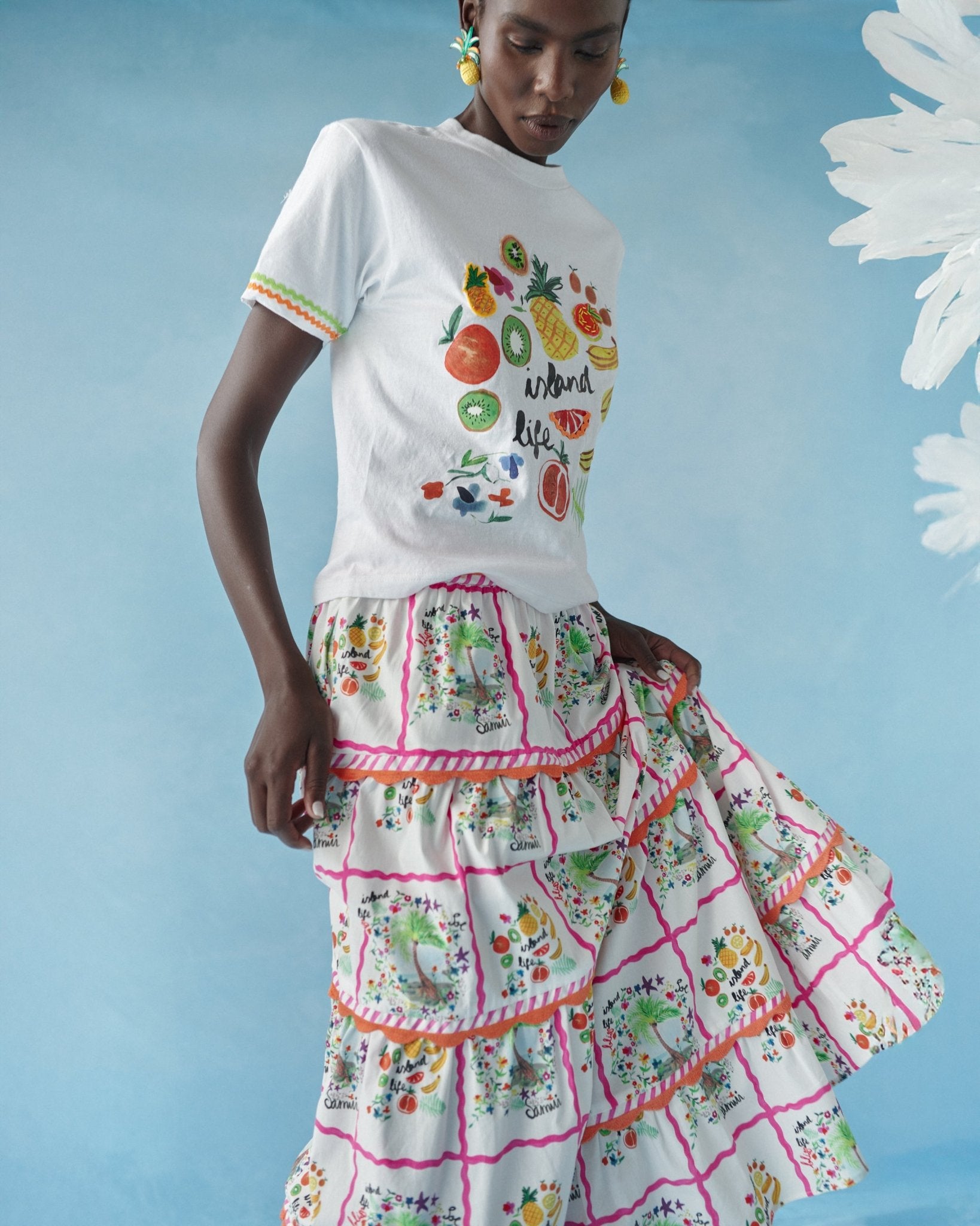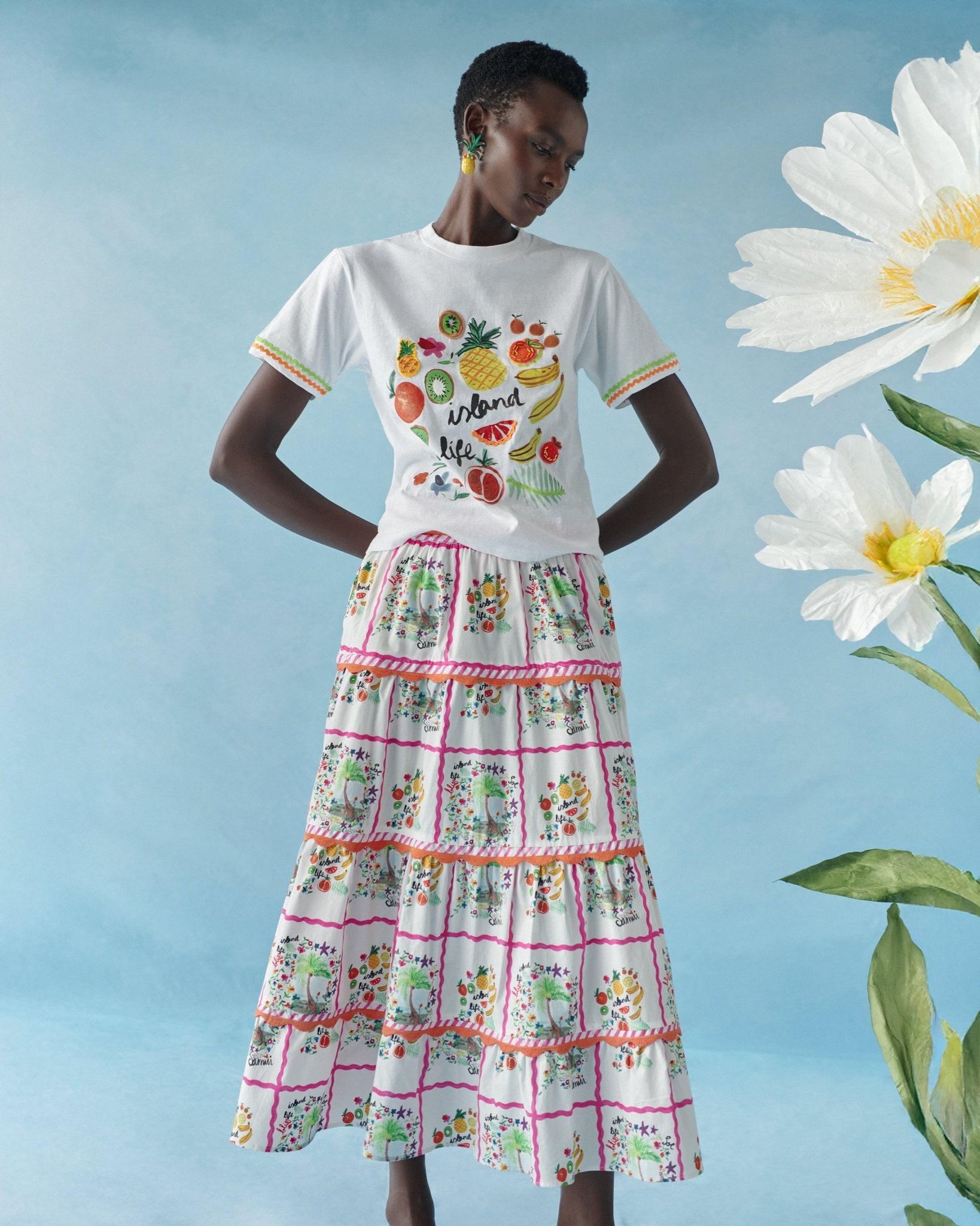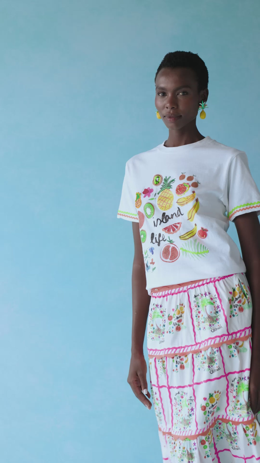 A vibrant cotton T-shirt featuring the exclusive tutti frutti print inspired by tropical fruits.